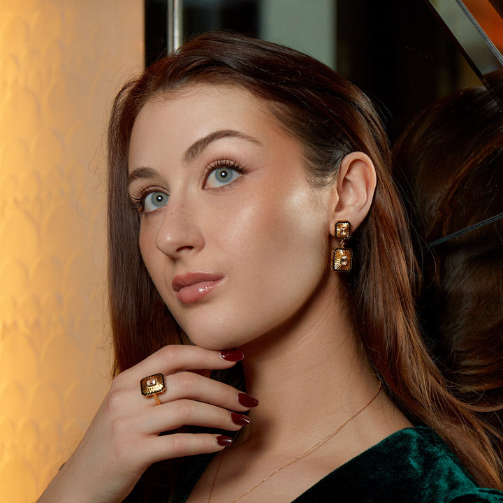 These Art Deco Fan Diamond Gold Statement Earrings by Augustine Jewels from the New York Collection are a bold and glamorous choice. Featuring lab-grown diamonds or moissanite totaling 0.3ct and 0.5ct with black enamel accents, the 36.5mm length earrings showcase octagon cut diamonds measuring 5x3mm and 6x4mm. Designed to blend classic architecture-inspired style with modern luxury for both everyday and special occasions.