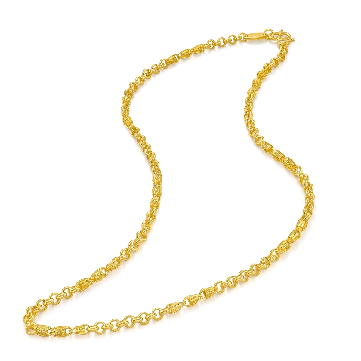 This 999.9 Gold Necklace by Chow Sang Sang features lovely layering of 3D engravings that create a radiant glow when worn solo or stacked with other pieces. It embodies the brand's commitment to quality and artistry, making it a standout choice for any jewelry lover.