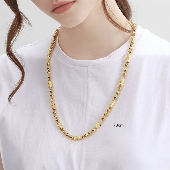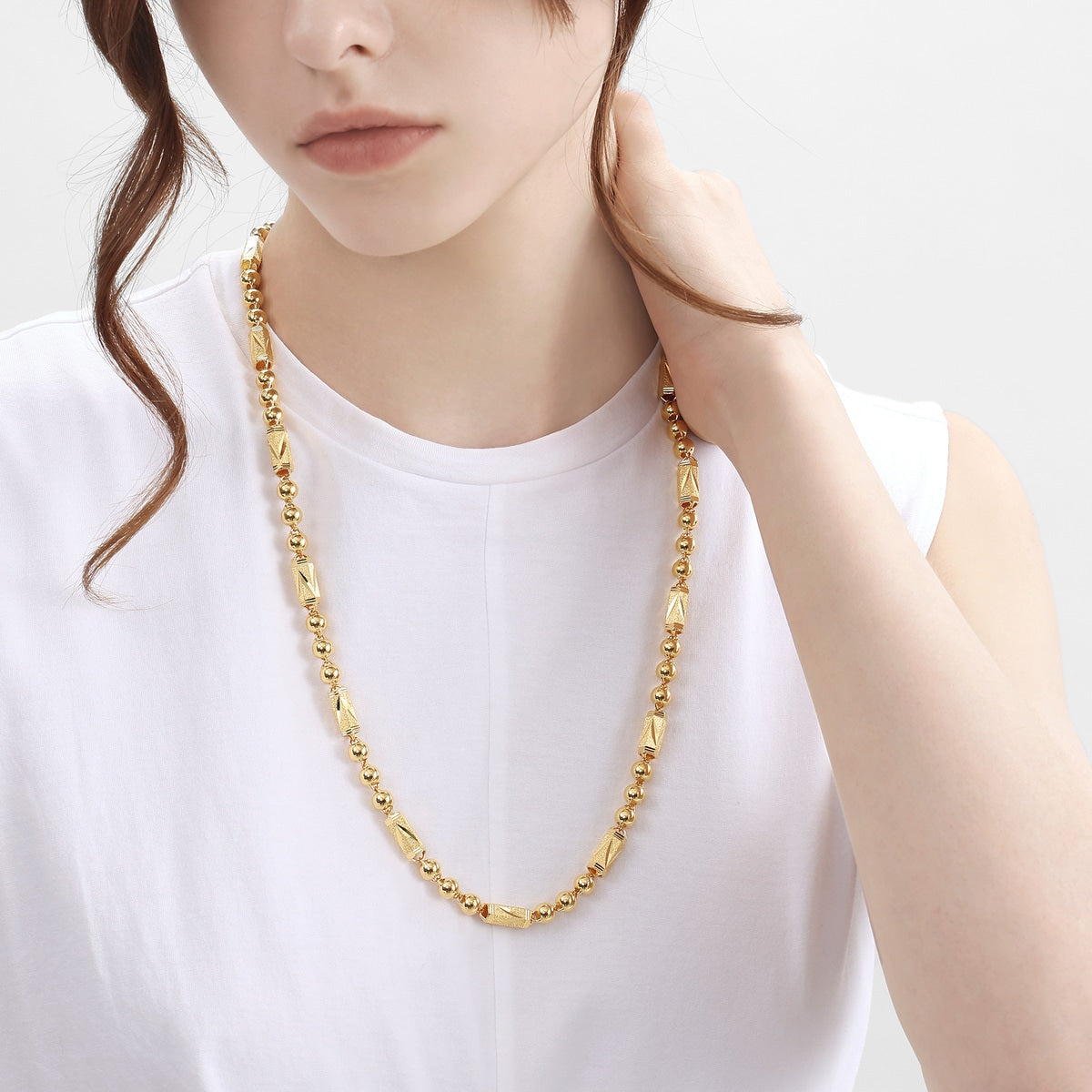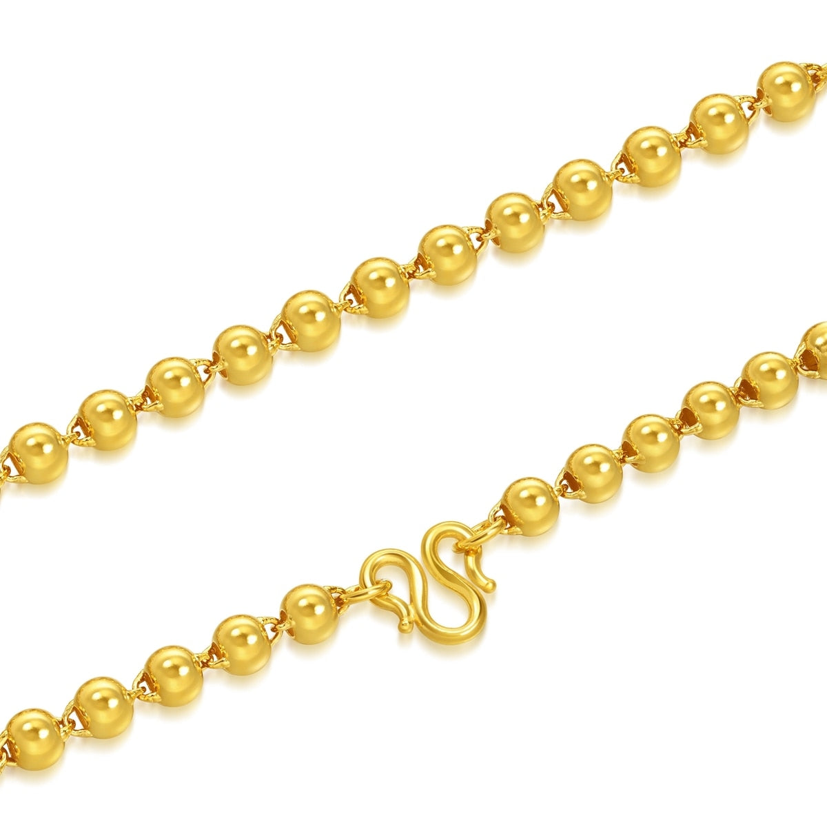 This 999.9 Gold Necklace by Chow Sang Sang features a stunning combination of bead and cylinder chains, enhanced by an engraving technique that creates a shimmering effect. It’s an attractive choice for layering or wearing solo, exuding elegance and charm.