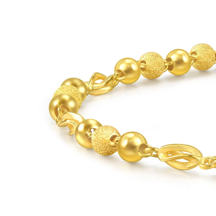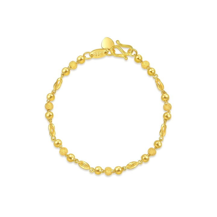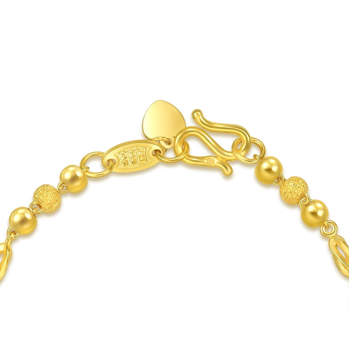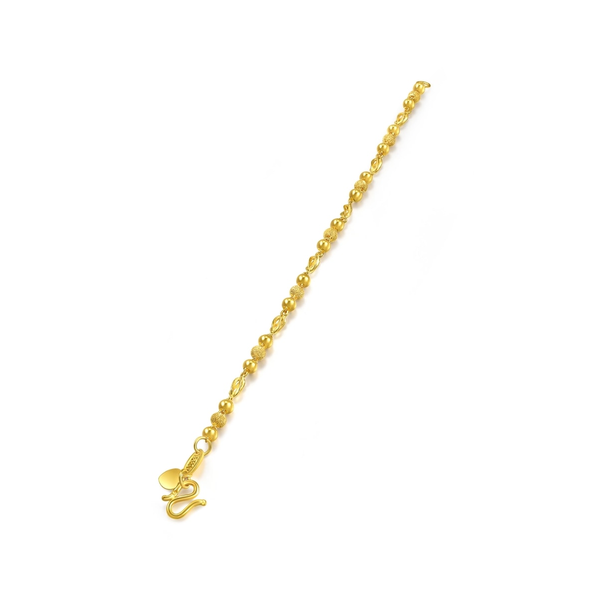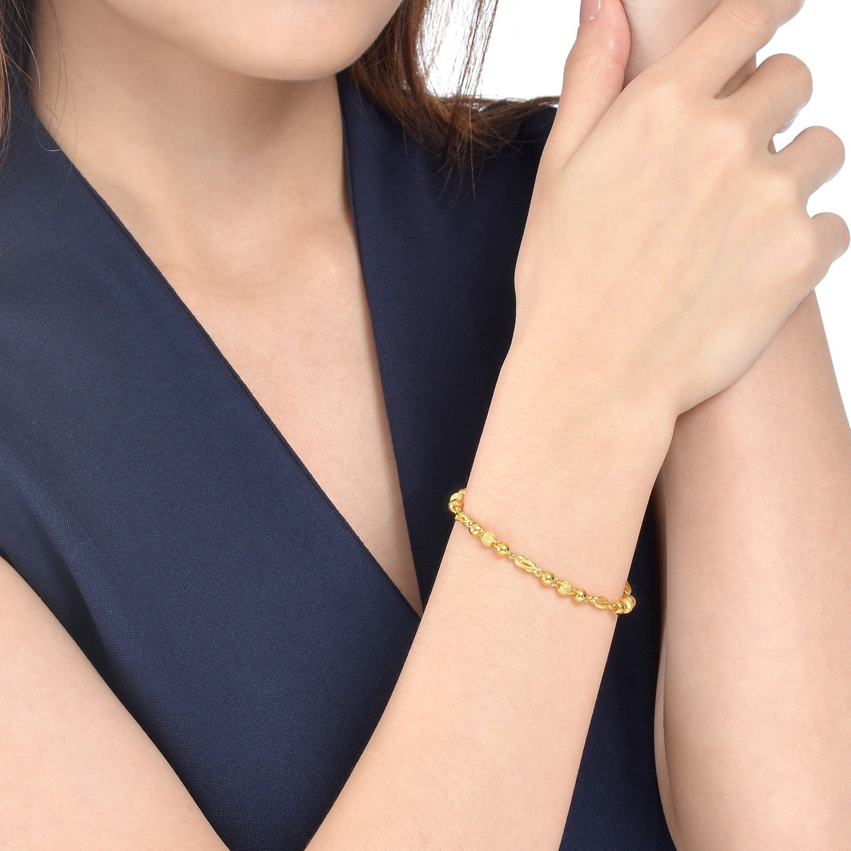 This 999.9 Gold Bracelet by Chow Sang Sang features a delicate design adorned with gold beads in various finishes and simple charms, offering a touch of playful elegance to your wrist. The bracelet’s lightweight and versatile design makes it perfect for everyday wear.
