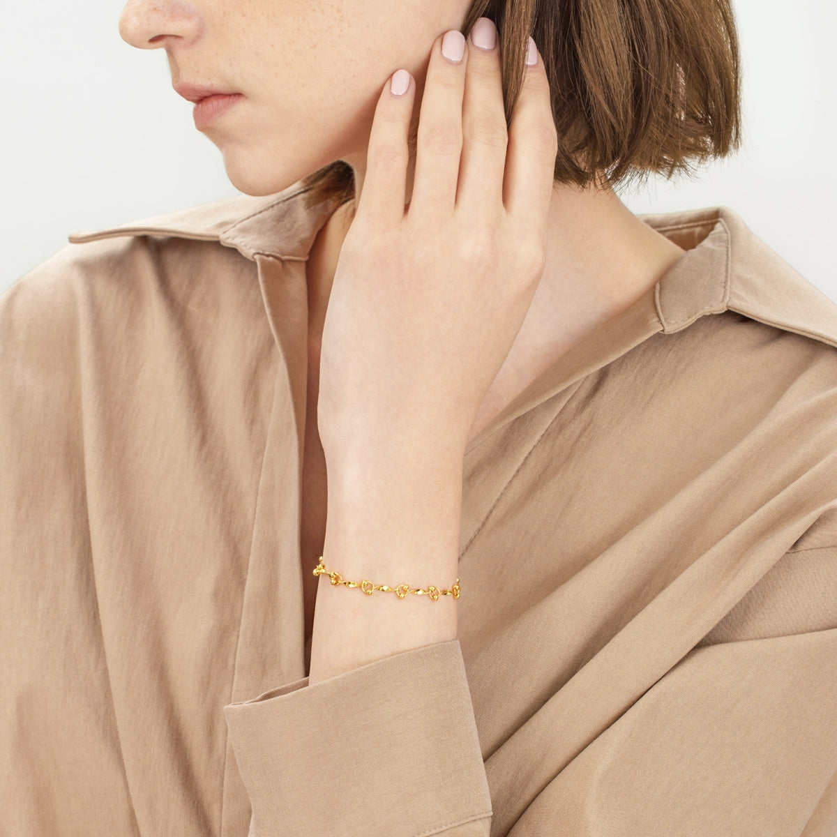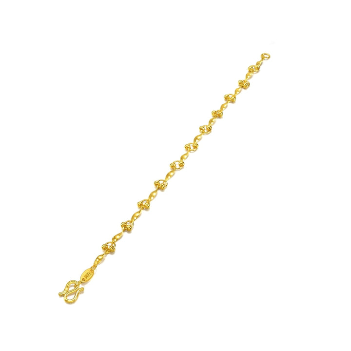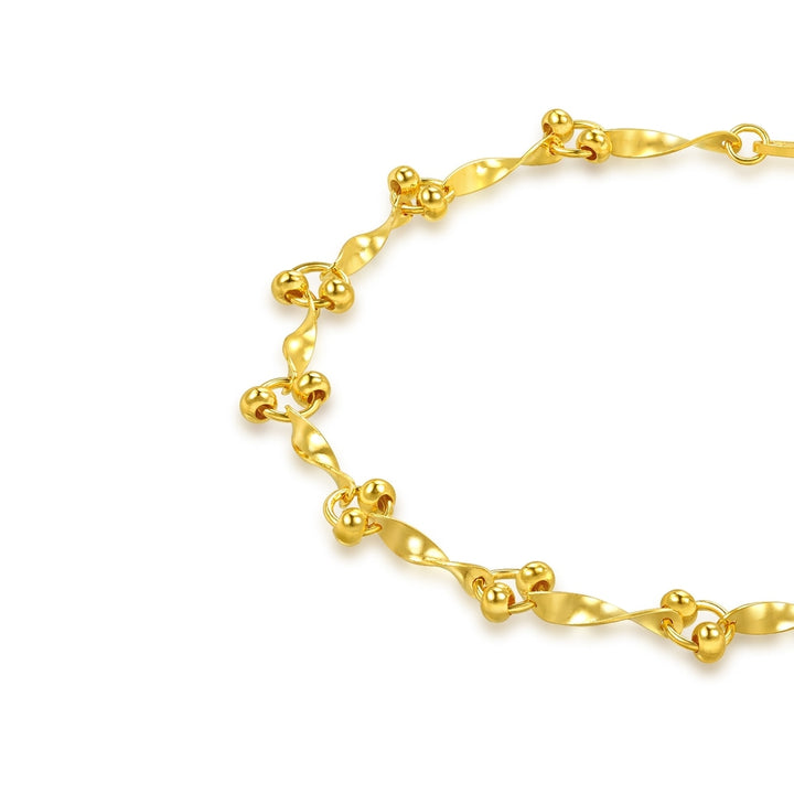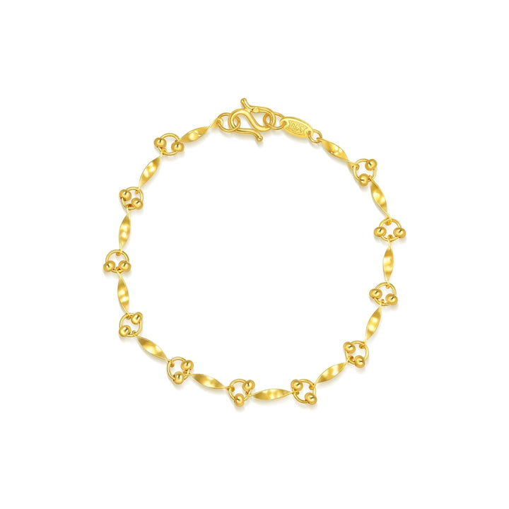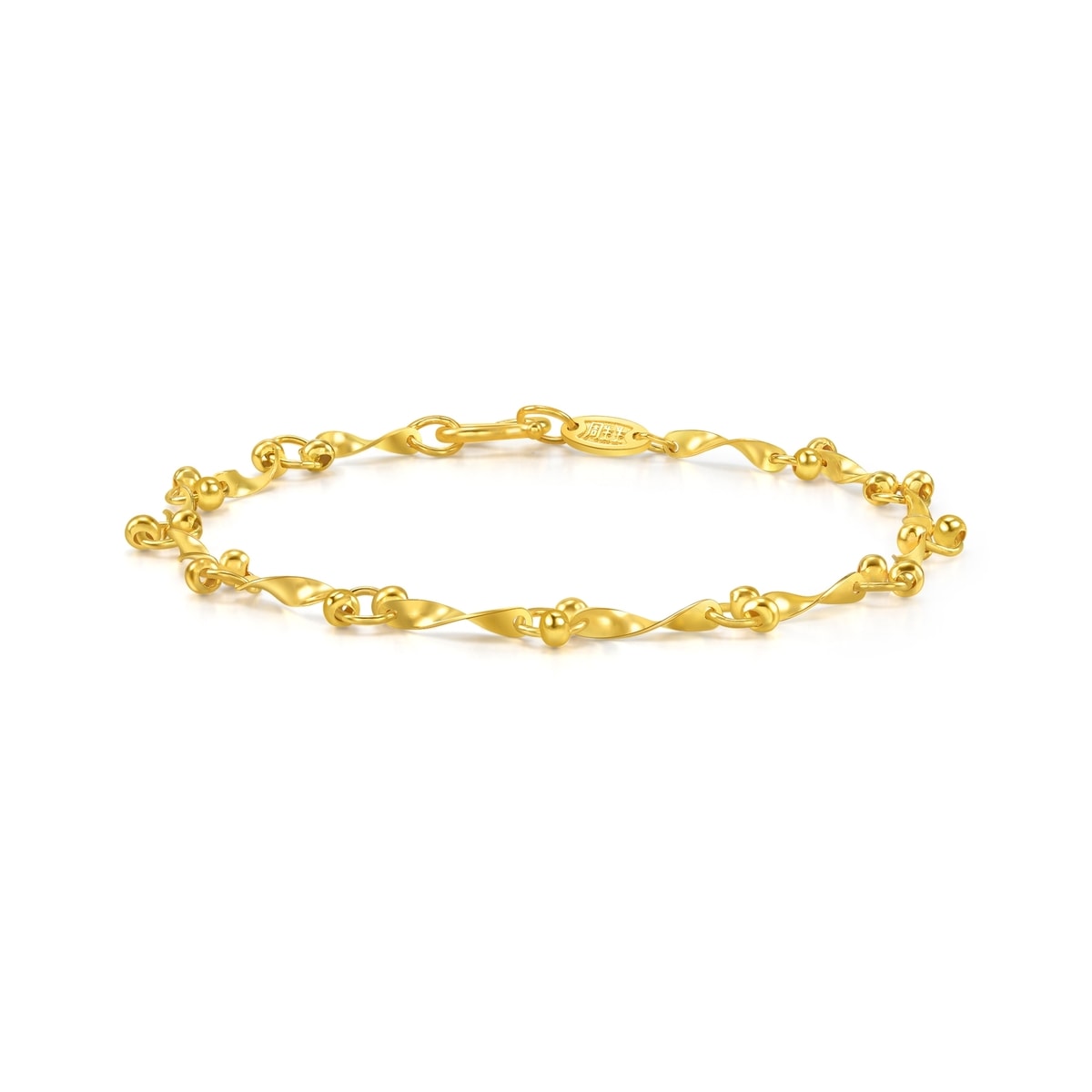 This 999.9 Gold Bracelet by Chow Sang Sang showcases a sophisticated design with gold beads, buckles, and twists that enhance its layered appearance. The bracelet’s elegant form shines with every movement, adding a touch of grace to any look.