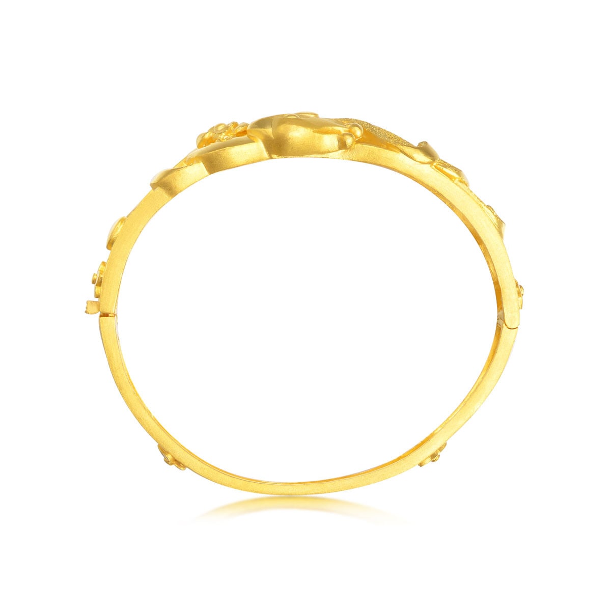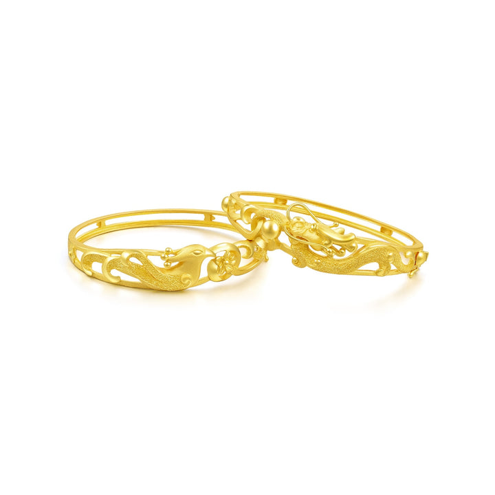This 'Dragon & Phoenix' 999.9 Gold Bangle by Chow Sang Sang ingeniously transforms the phoenix’s body into a dynamic bangle, while the dragon represents prosperity and vigor. The intricate design makes this a standout piece, celebrating traditional Chinese motifs with a modern touch.