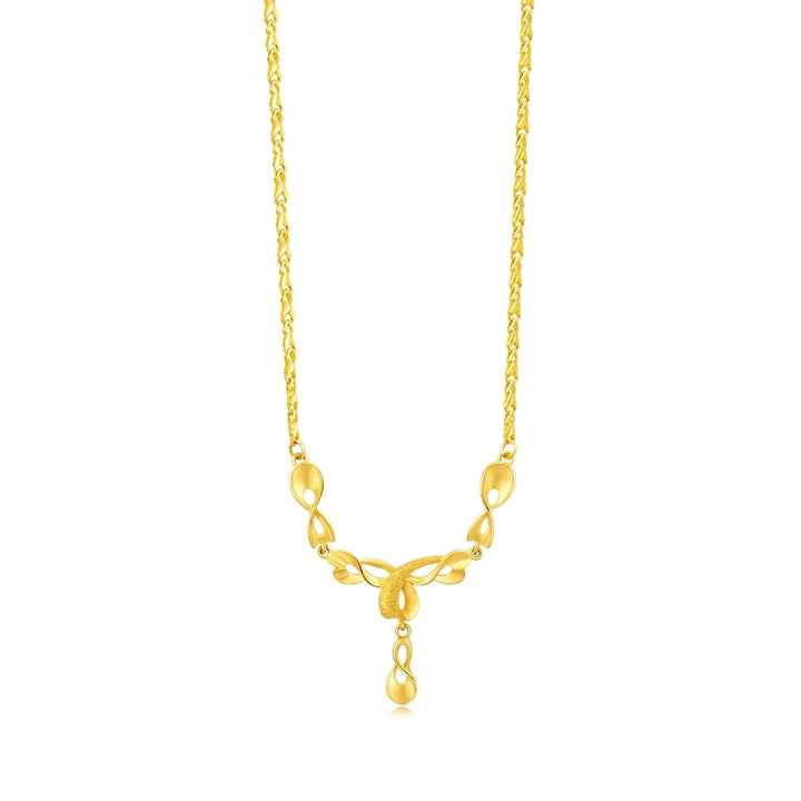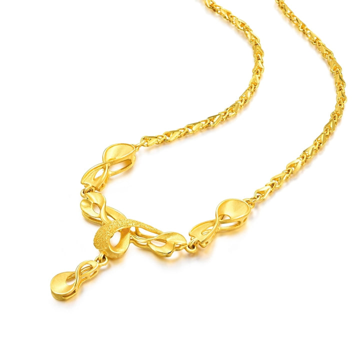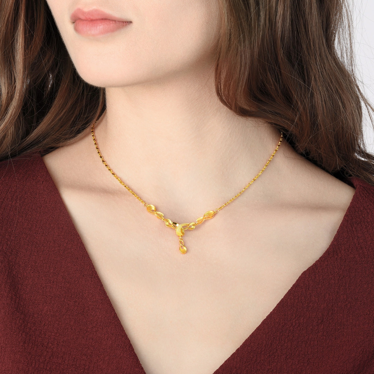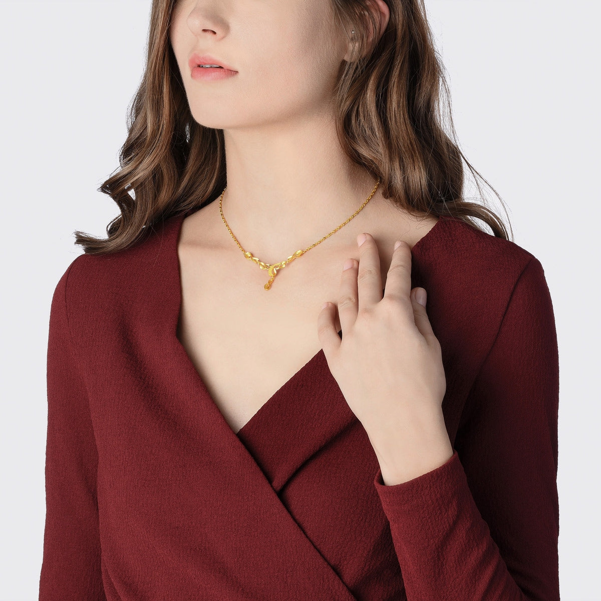 This 999.9 Gold Necklace by Chow Sang Sang features delicate petal designs that swing gracefully with the wearer’s movement. Enhanced by sandblasting, the necklace creates a refined layering effect, offering an elegant and timeless style.
