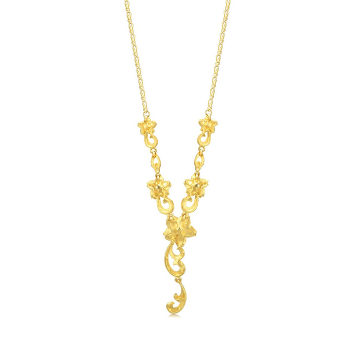 This 999.9 Gold Necklace by Chow Sang Sang is adorned with blooming flowers, symbolizing prosperity, good fortune, and a wish for lifelong happiness. The intricate design adds a touch of elegance and cultural significance, making it a perfect statement piece.
