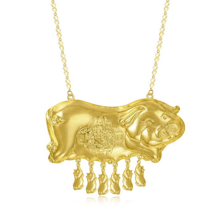 This 999.9 Gold Pig Necklace by Chow Sang Sang features a charming and bold design, showcasing a gold pig symbolizing prosperity and good fortune. The necklace’s substantial weight and 50cm length make it a standout piece with cultural significance and timeless appeal.