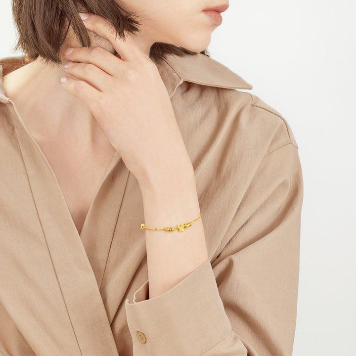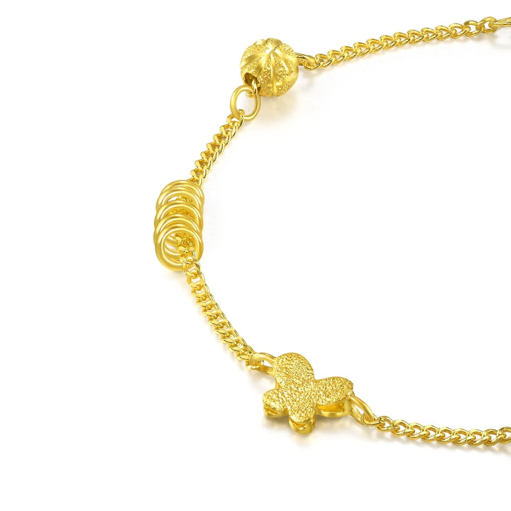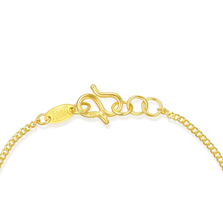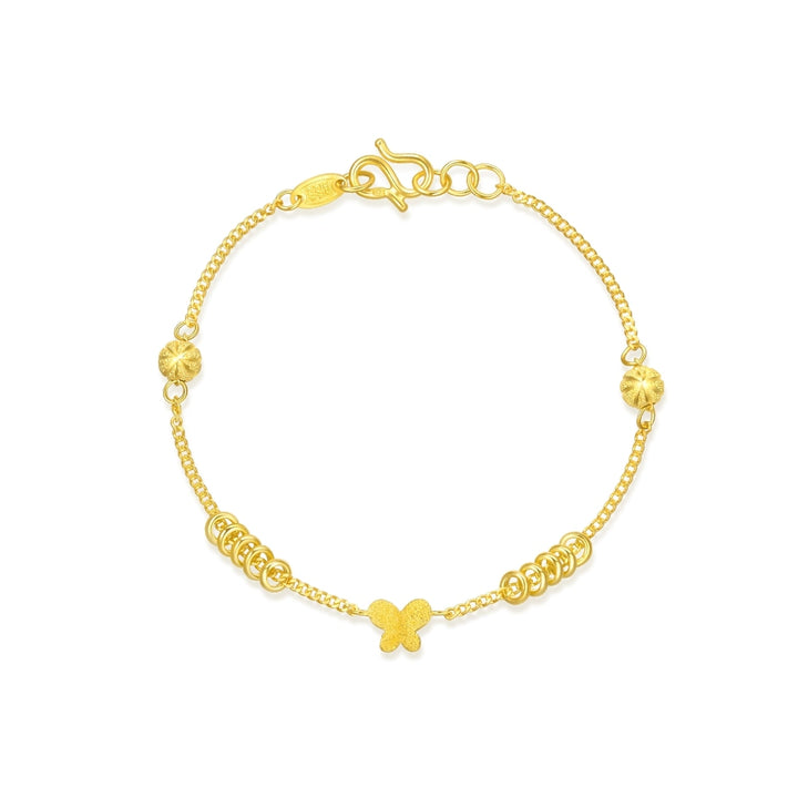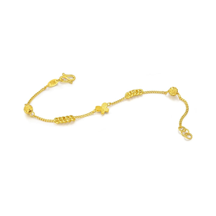 This 999.9 Gold Butterfly Bracelet by Chow Sang Sang offers a minimalist design with delicate butterfly details, enhanced by sandblasting and small hoop embellishments. This graceful bracelet adds a touch of elegance to your wrist, perfect for layering or wearing solo.