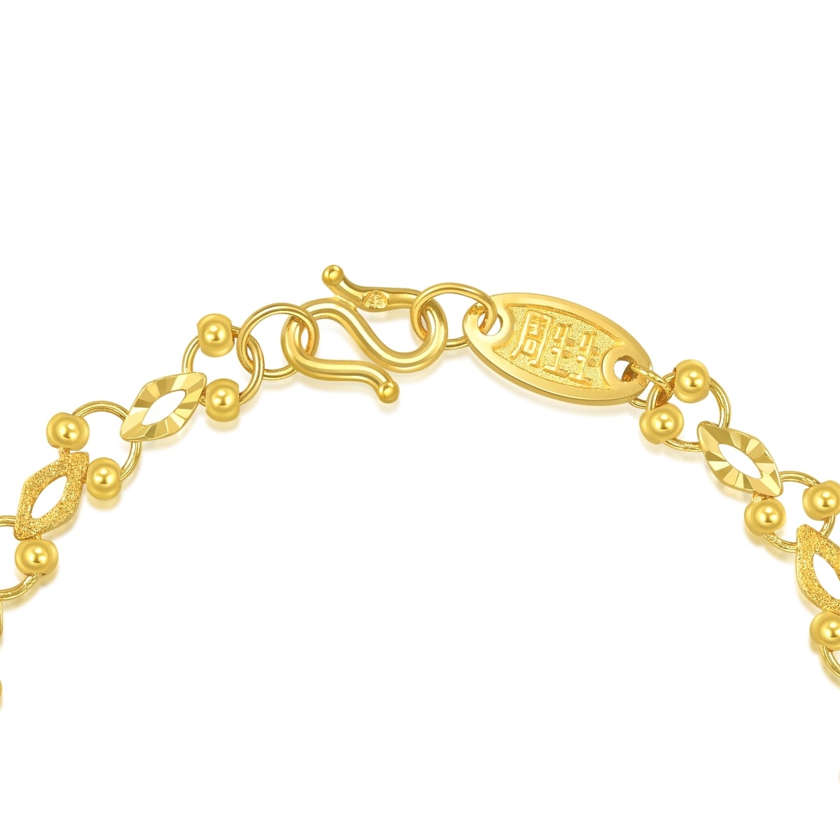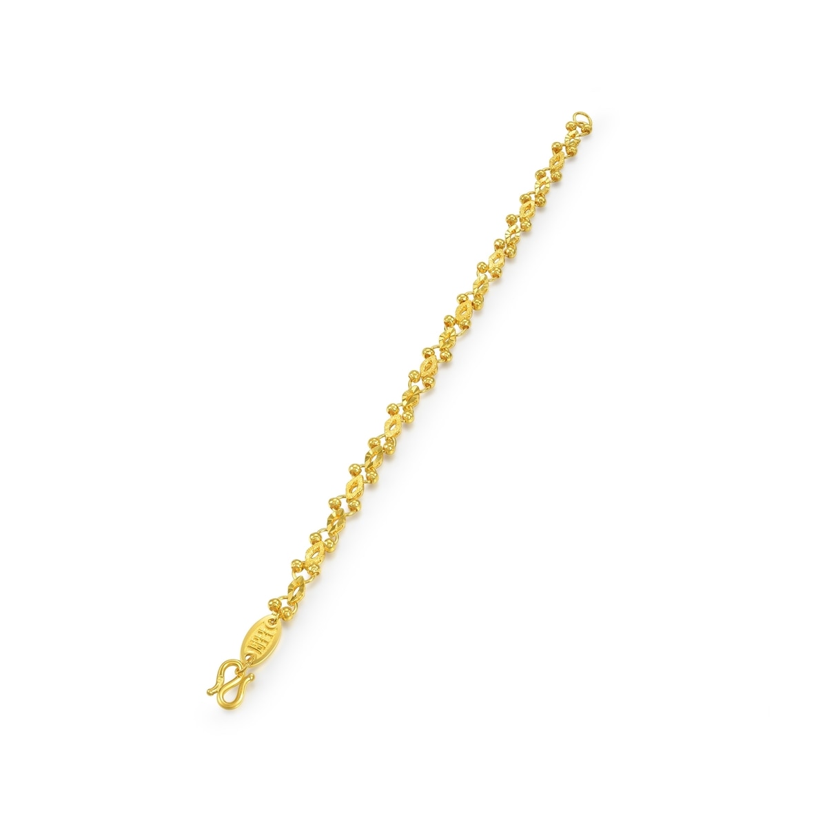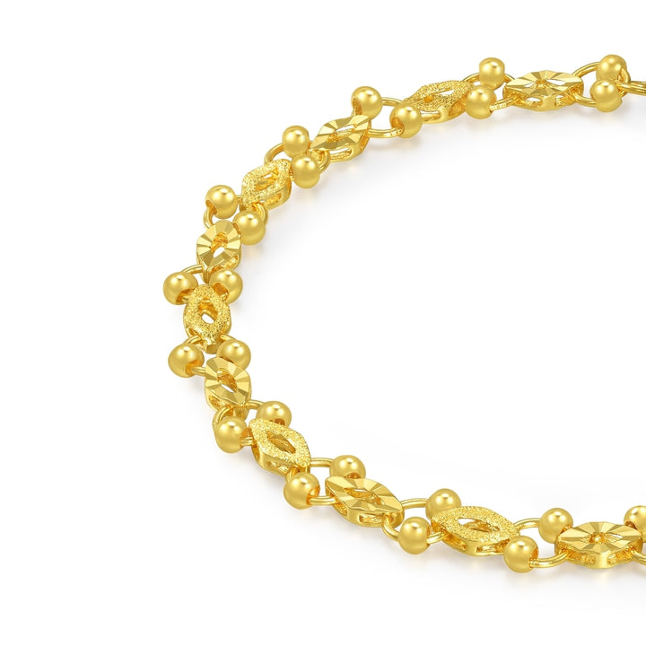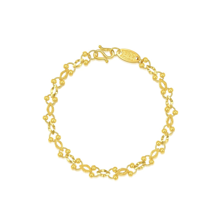 This 999.9 Gold Bracelet by Chow Sang Sang is embellished with gold beads and refined by engraving and sandblasting techniques. The joyful design adds enhanced layering and texture, making it a playful yet sophisticated accessory for everyday wear.