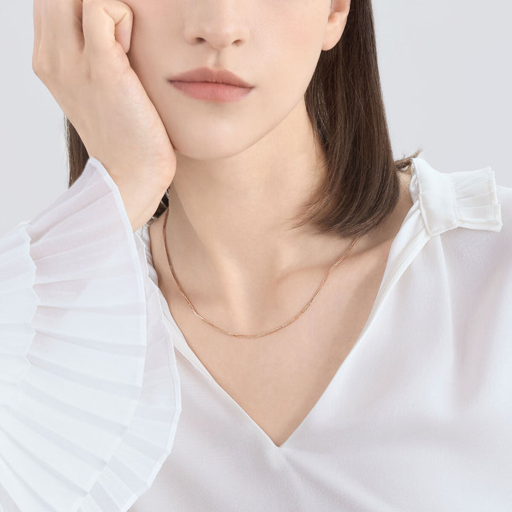 This 18K Rose Gold Necklace by Chow Sang Sang offers a versatile and simple design, perfect for adding a touch of fashionable style when worn solo or styled with an expressive pendant. The 45cm length allows for effortless layering or standalone elegance.