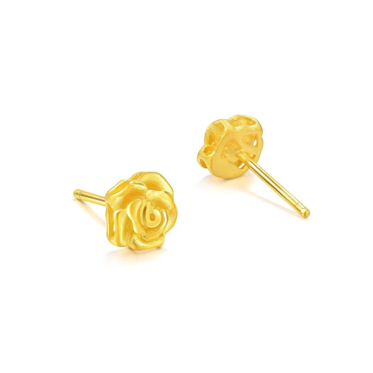 These 999.9 Gold Rose Earrings by Chow Sang Sang are delicately crafted with a matte finish, highlighting the intricate details and feminine elegance of the design. These rose-shaped earrings are perfect for those who appreciate a noble and refined look.