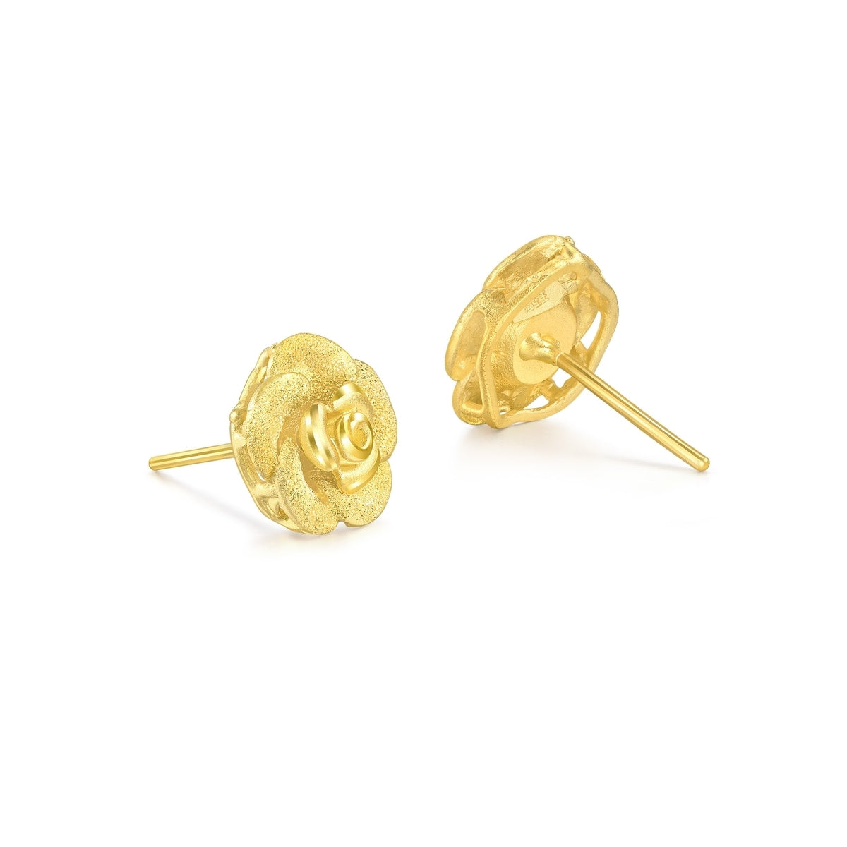 These 999.9 Gold Rose-Inspired Earrings by Chow Sang Sang bring grace and sophistication to any look. Enhanced by sand blasting, these 3D rose earrings bloom with elegance, making them a perfect statement piece.