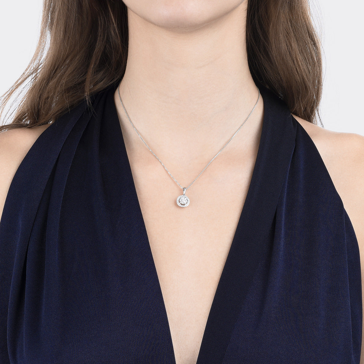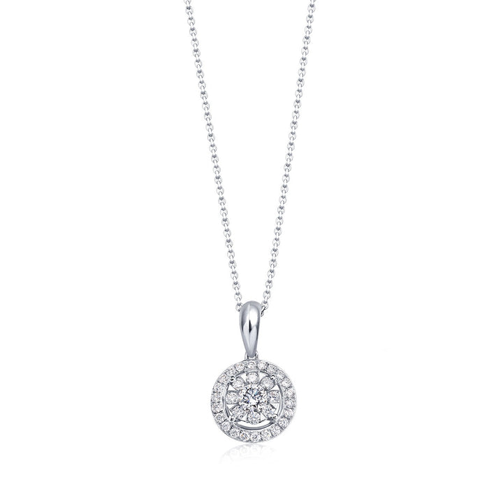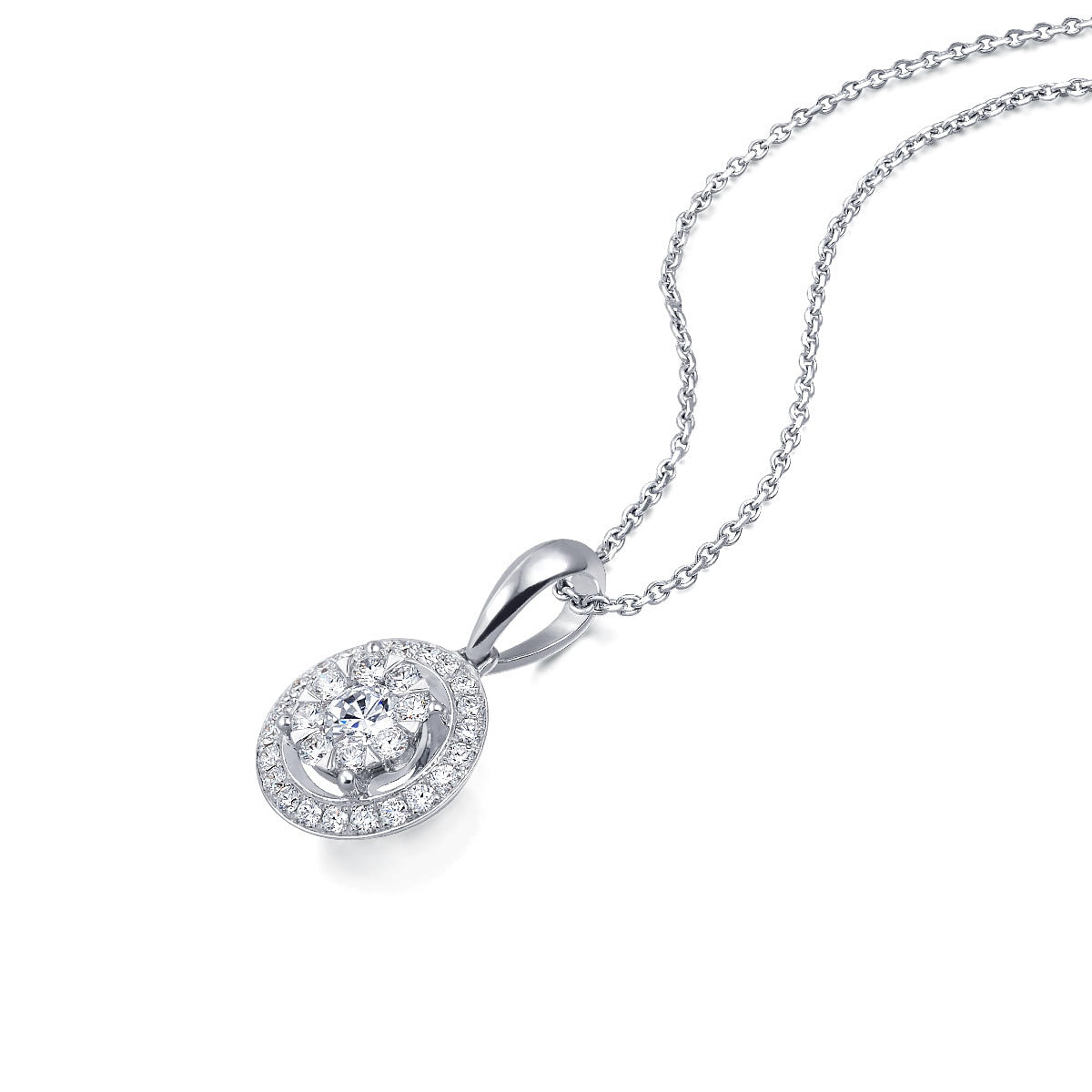 This 'Classics' 18K White Gold Diamond Pendant by Chow Sang Sang features a scintillating wheel design with eight smaller diamonds surrounding the center stone, offering a vibrant and shimmering effect.