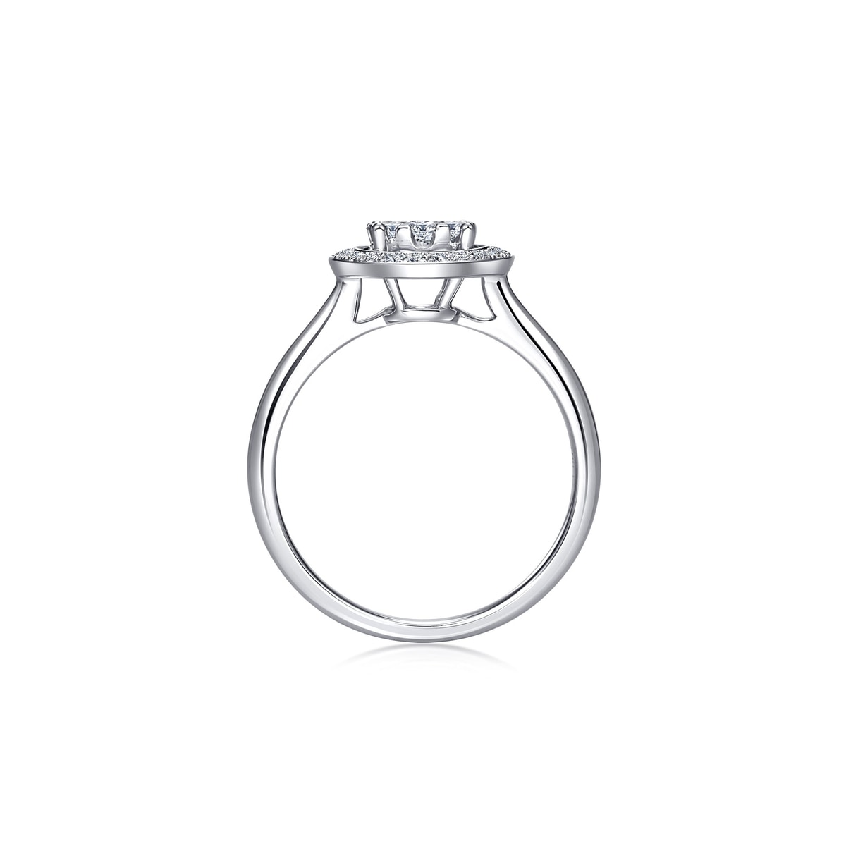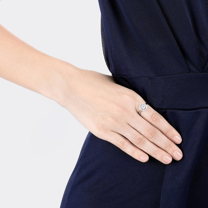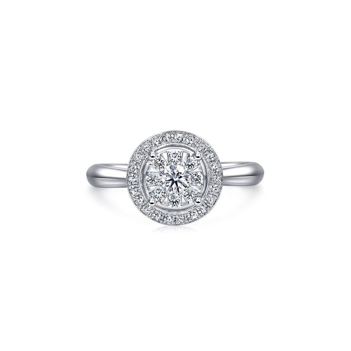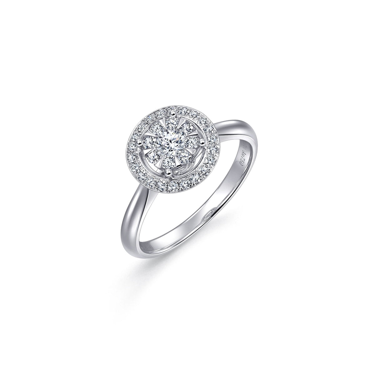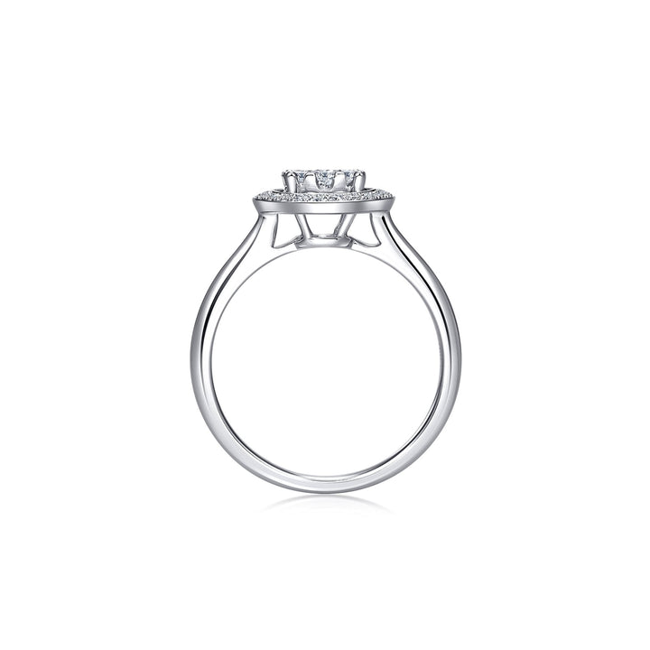 This 'Classics' 18K White Gold Diamond Ring by Chow Sang Sang showcases a scintillating wheel design with eight smaller diamonds surrounding the center stone, enhancing its shimmer and vibrancy.