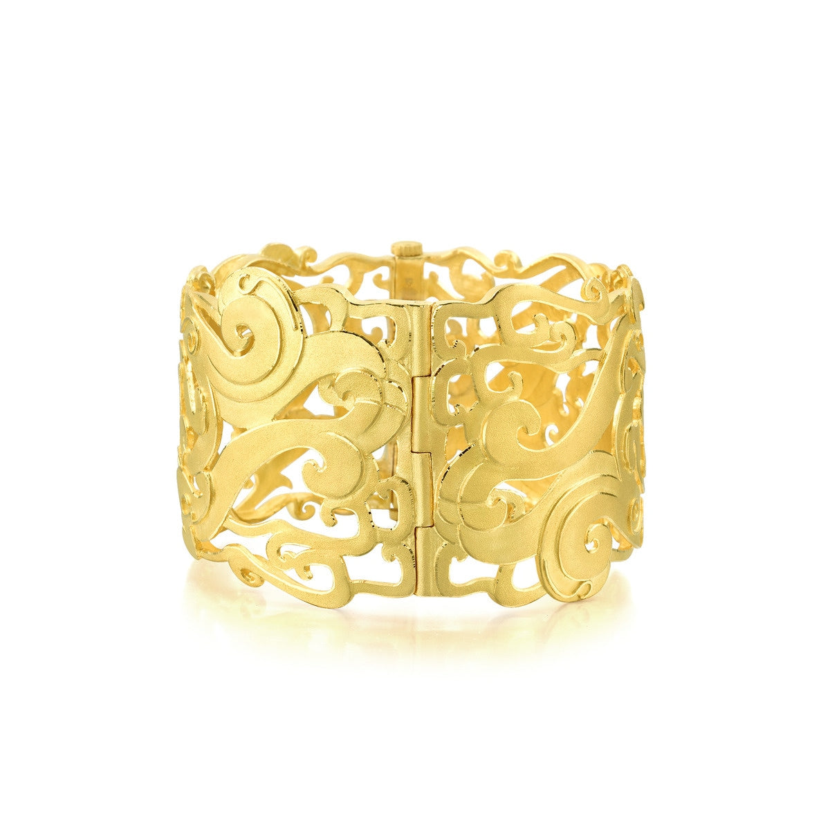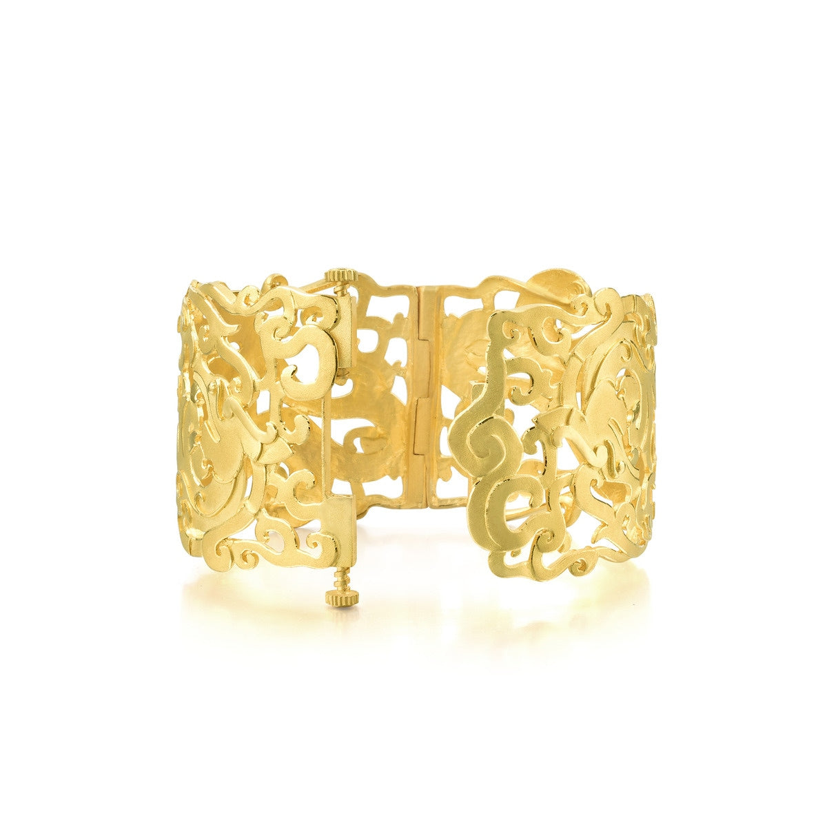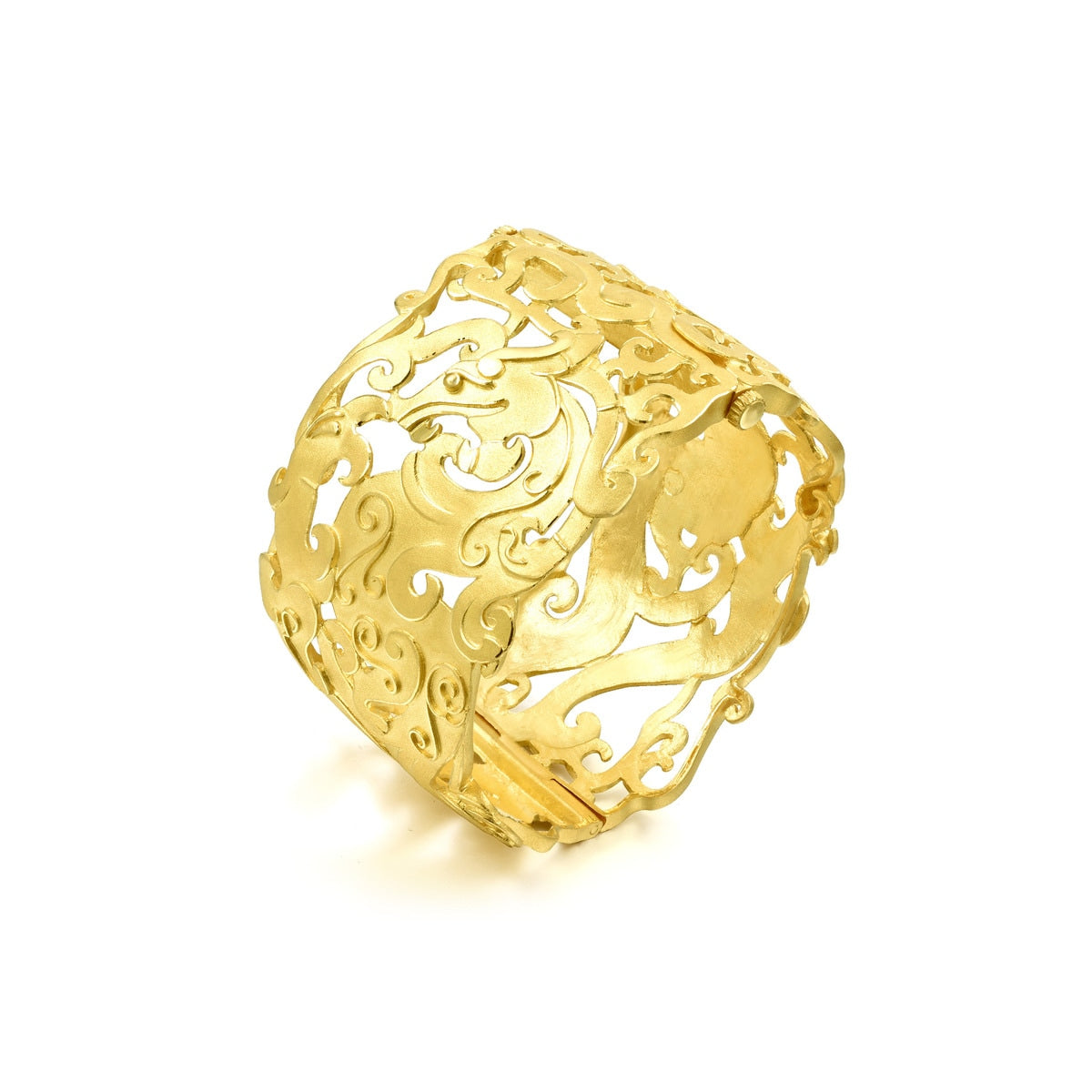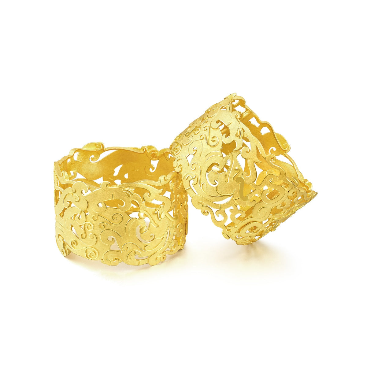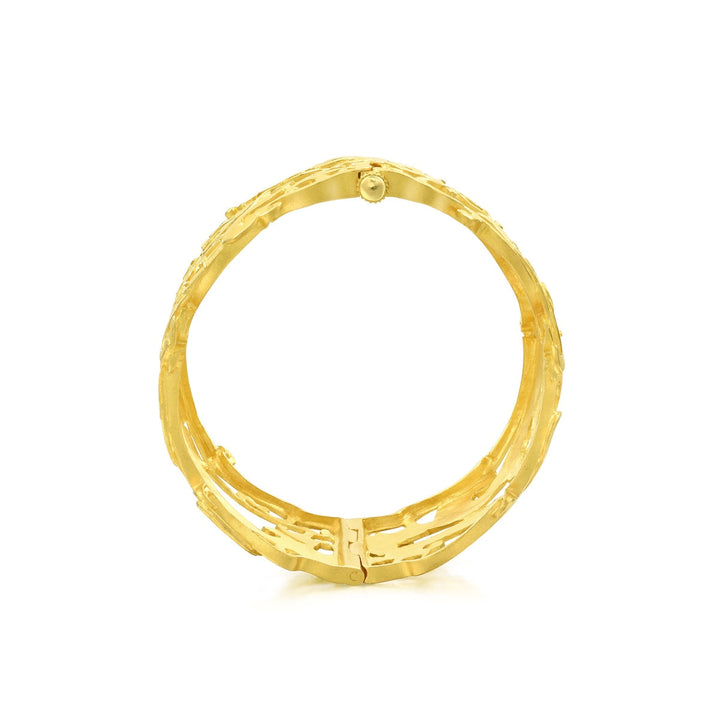 This 'Dragon & Phoenix' 999.9 Gold Bangle by Chow Sang Sang reincarnates the jade engraving styles of the Shang and Zhou Dynasties, depicting dragons and phoenixes in a dynamic design. This bangle symbolizes prosperity and traditional Chinese values.