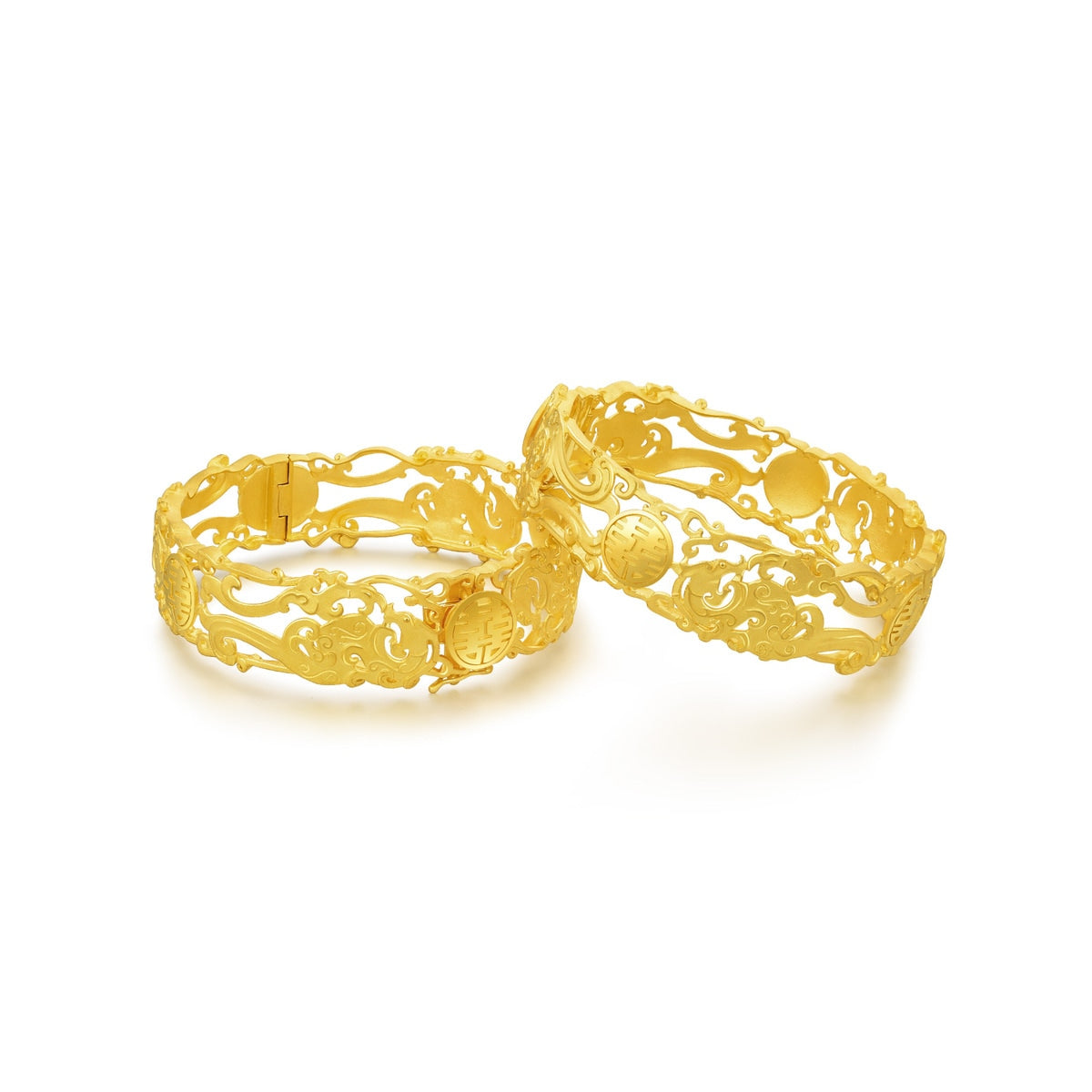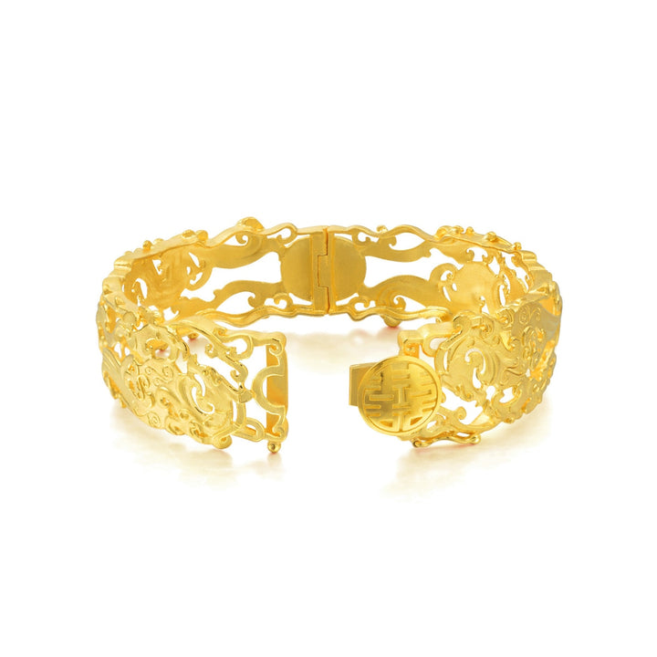 This 'Dragon & Phoenix' 999.9 Gold Bangle by Chow Sang Sang features dragons and phoenixes, traditional Chinese symbols of prosperity. The gold buckle is adorned with the Chinese character '囍' meaning double happiness, adding festive elegance.