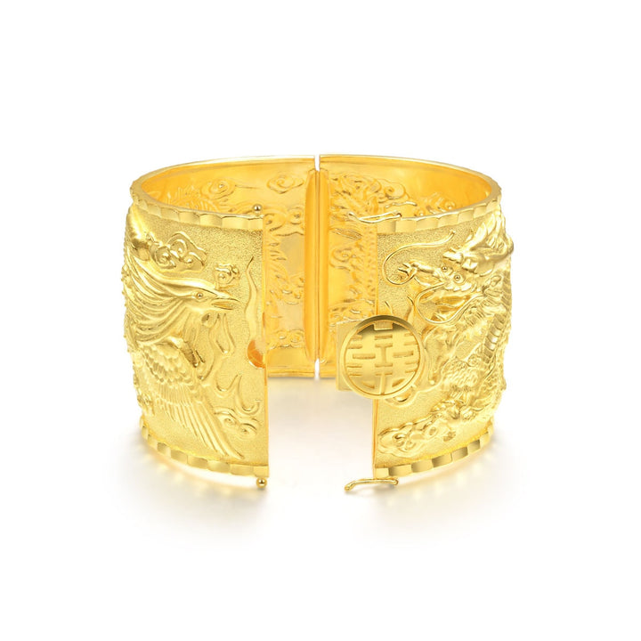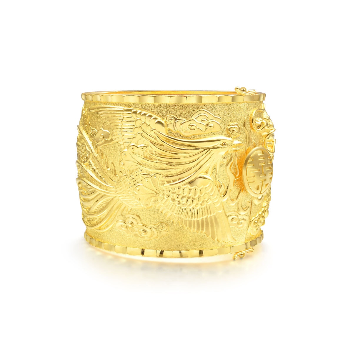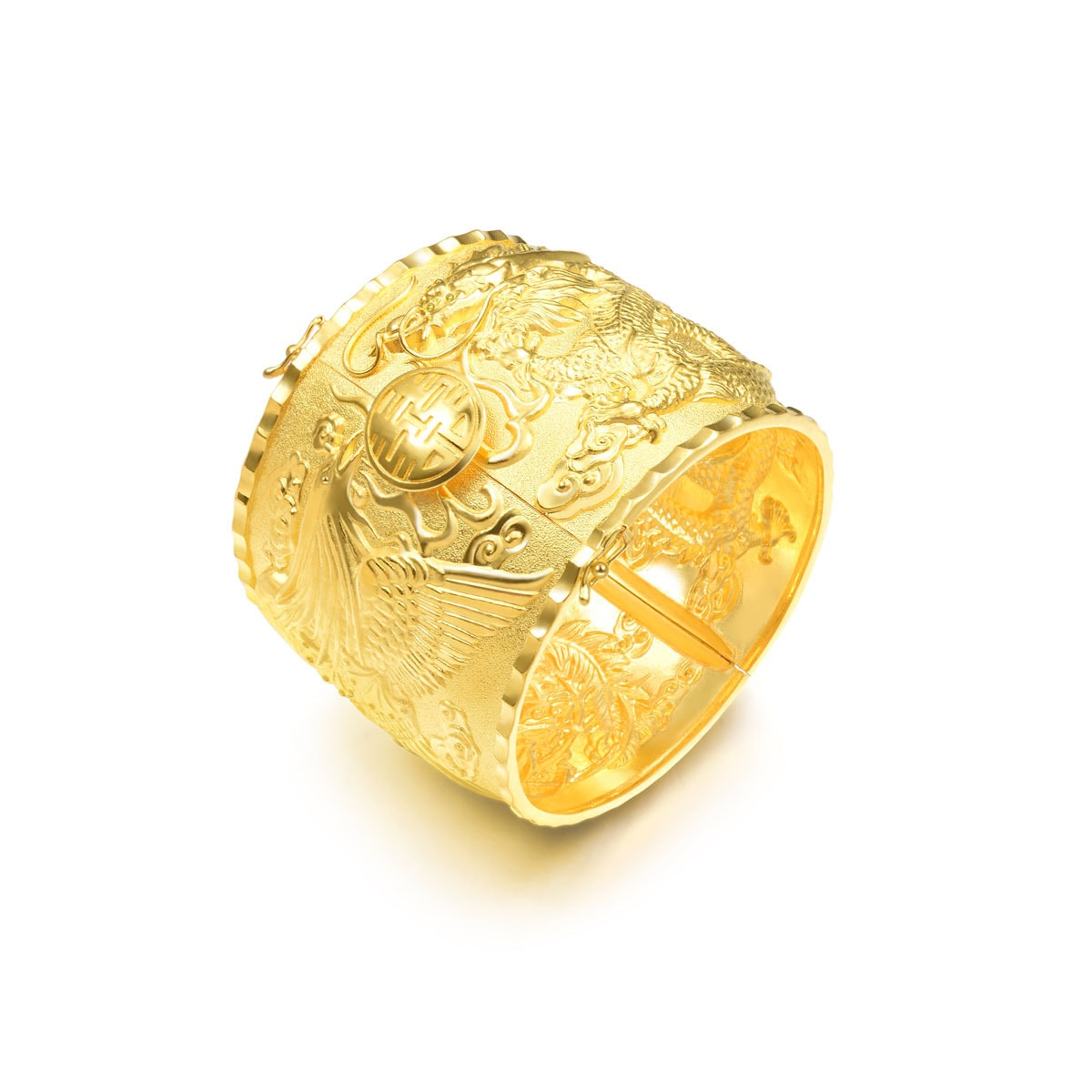 This 'Dragon & Phoenix' 999.9 Gold Bangle by Chow Sang Sang is meticulously sculpted to add dimension and allure, offering both depth and intricate detail, perfect for a Chinese wedding dress.