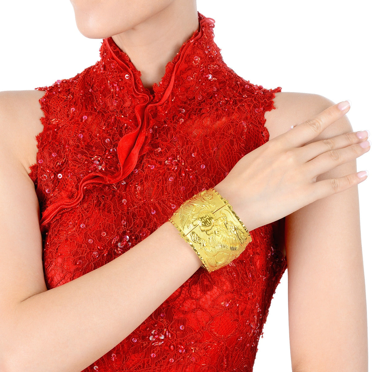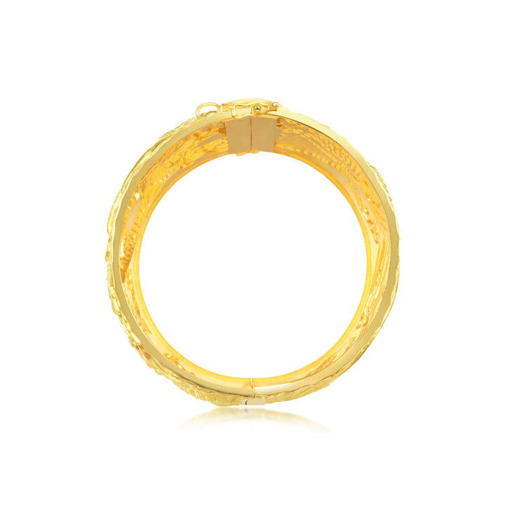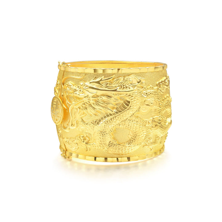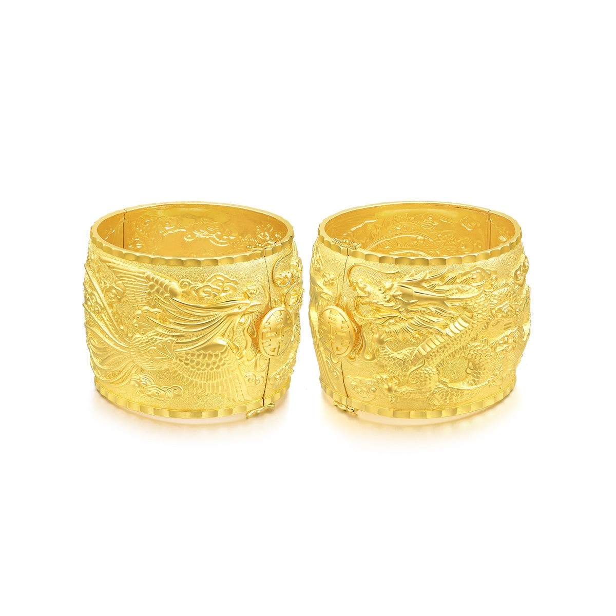 This 'Dragon & Phoenix' 999.9 Gold Bangle by Chow Sang Sang is meticulously sculpted to add dimension and allure, offering both depth and intricate detail, perfect for a Chinese wedding dress.