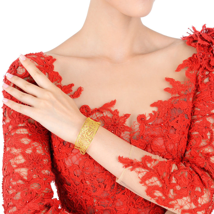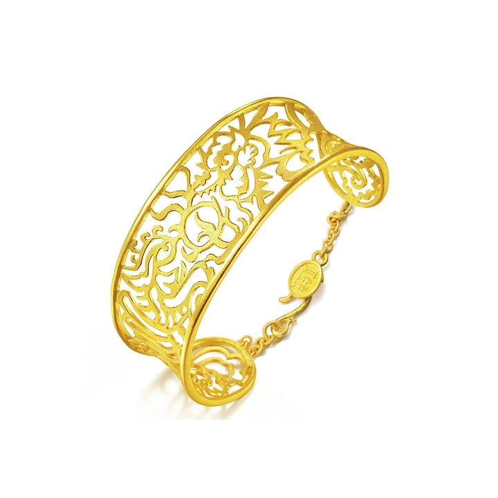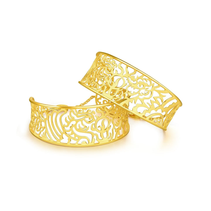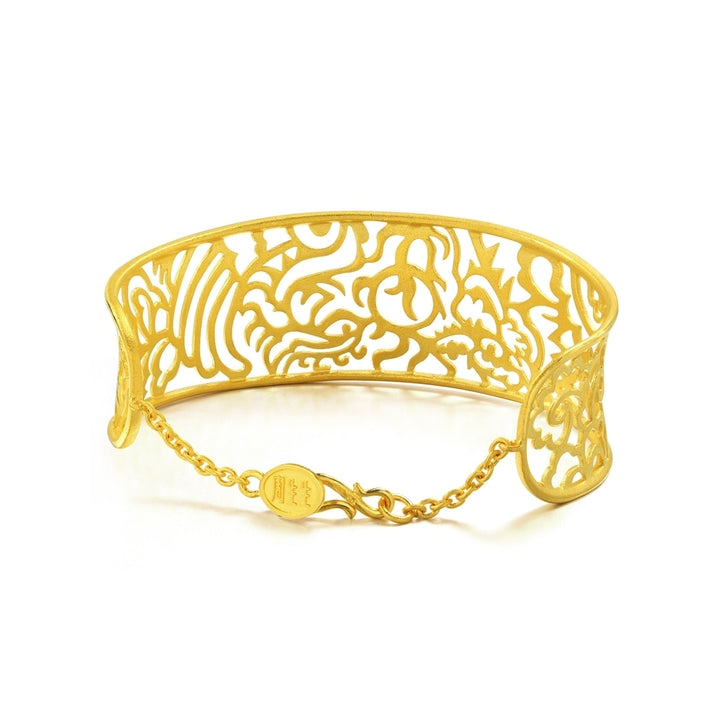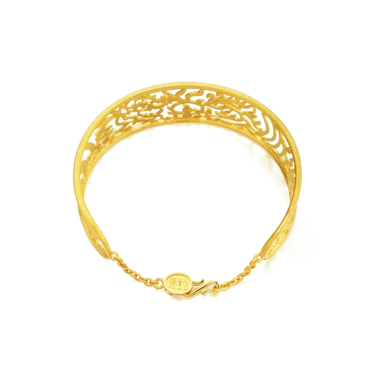 This 'Dragon & Phoenix' 999.9 Gold Bangle by Chow Sang Sang is delicately adorned with dragons and phoenixes, symbolizing prosperity and traditional values. A perfect addition to any Chinese wedding.