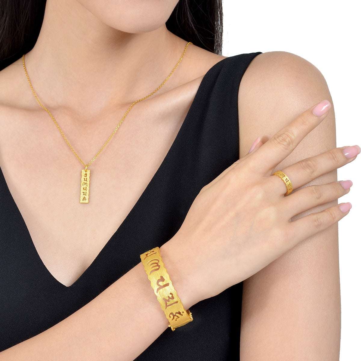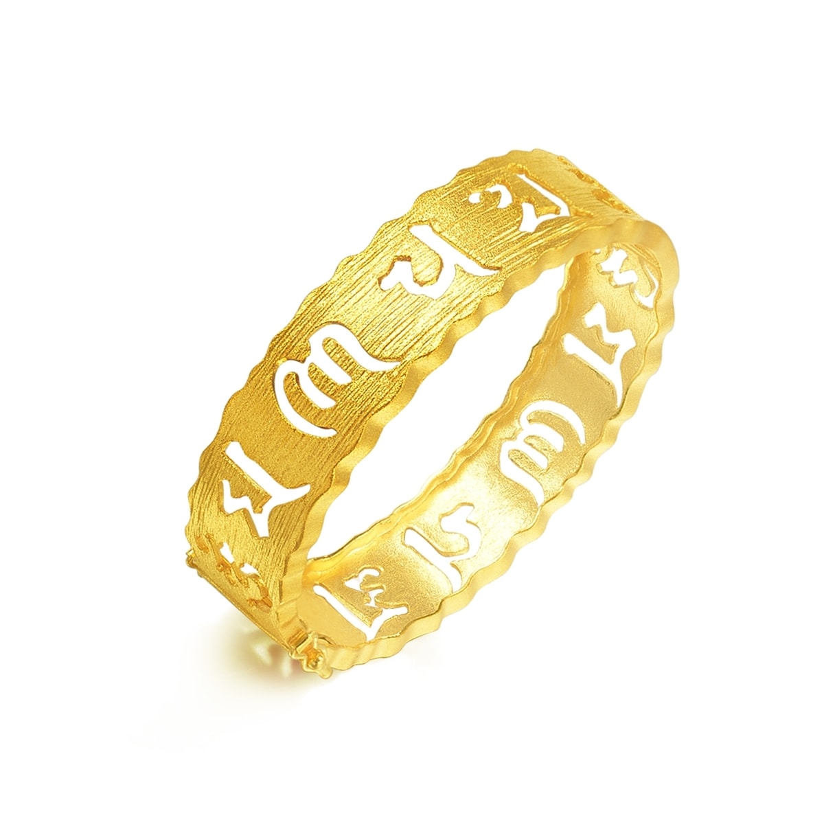 This 'Om Mani Padme Hum' 999.9 Gold Bangle by Chow Sang Sang celebrates Mahayana Buddhism’s rich cultural heritage with an elegant design. Combining modern artistry and the six characters of the mantra, this pure gold collector's piece symbolizes the quest for enlightenment.