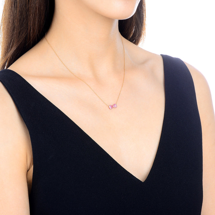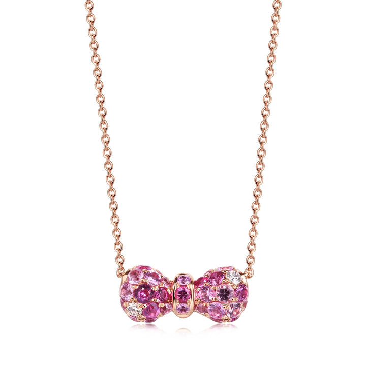 This 18K Rose Gold Pink Sapphire Necklace by Chow Sang Sang features a delicate pink sapphire ribbon design. The simple yet elegant piece is perfect for everyday wear, adding a touch of femininity to any outfit.