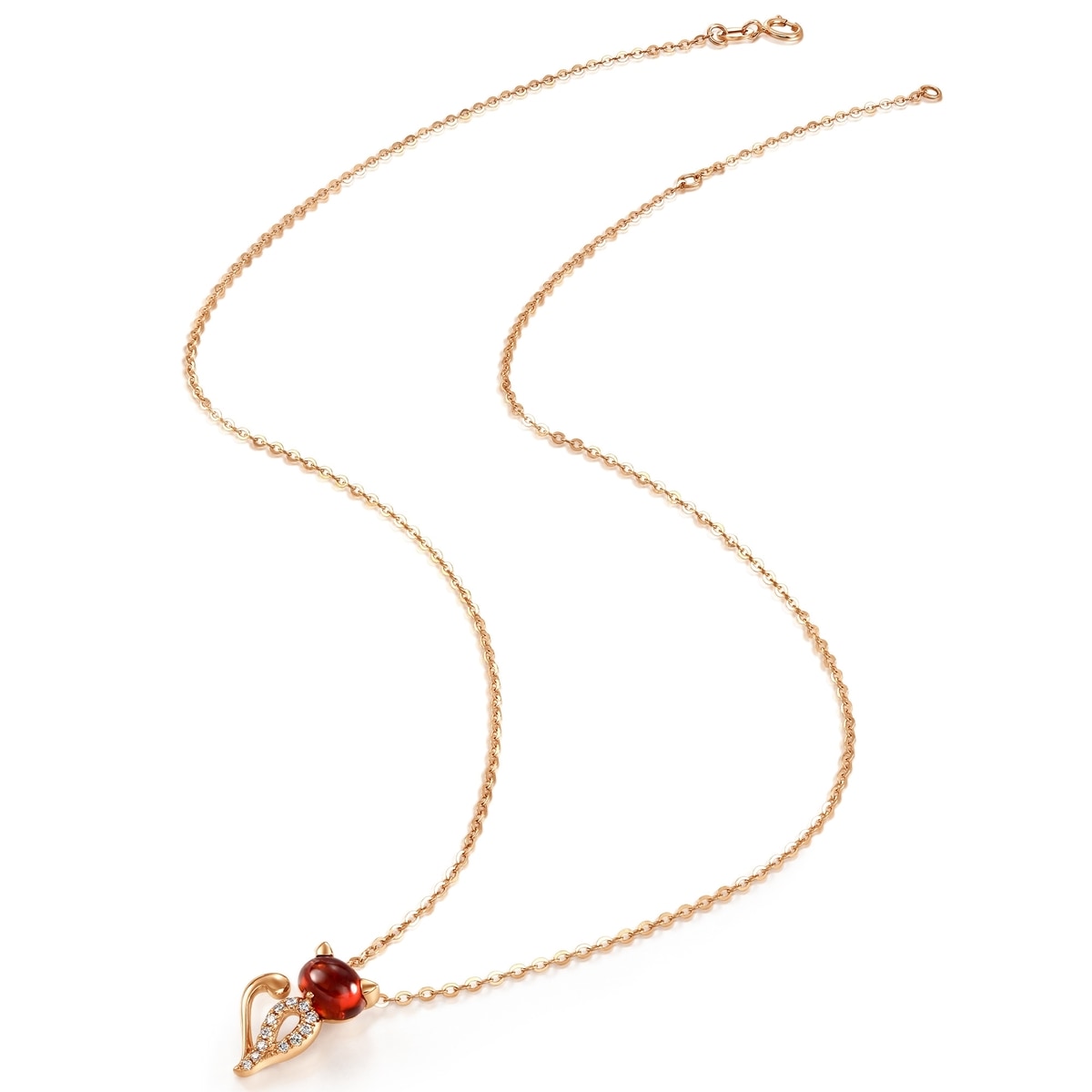 This 18K Rose Gold Almandite Necklace by Chow Sang Sang showcases an exotic kitten pendant adorned with a vibrant almandite gemstone. Part of a whimsical collection featuring various animals, this playful piece brings a pop of color and charm to your style.