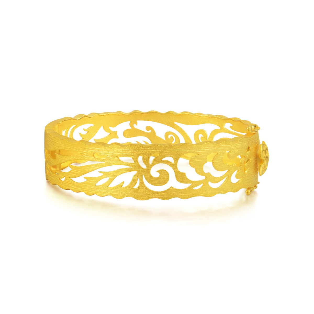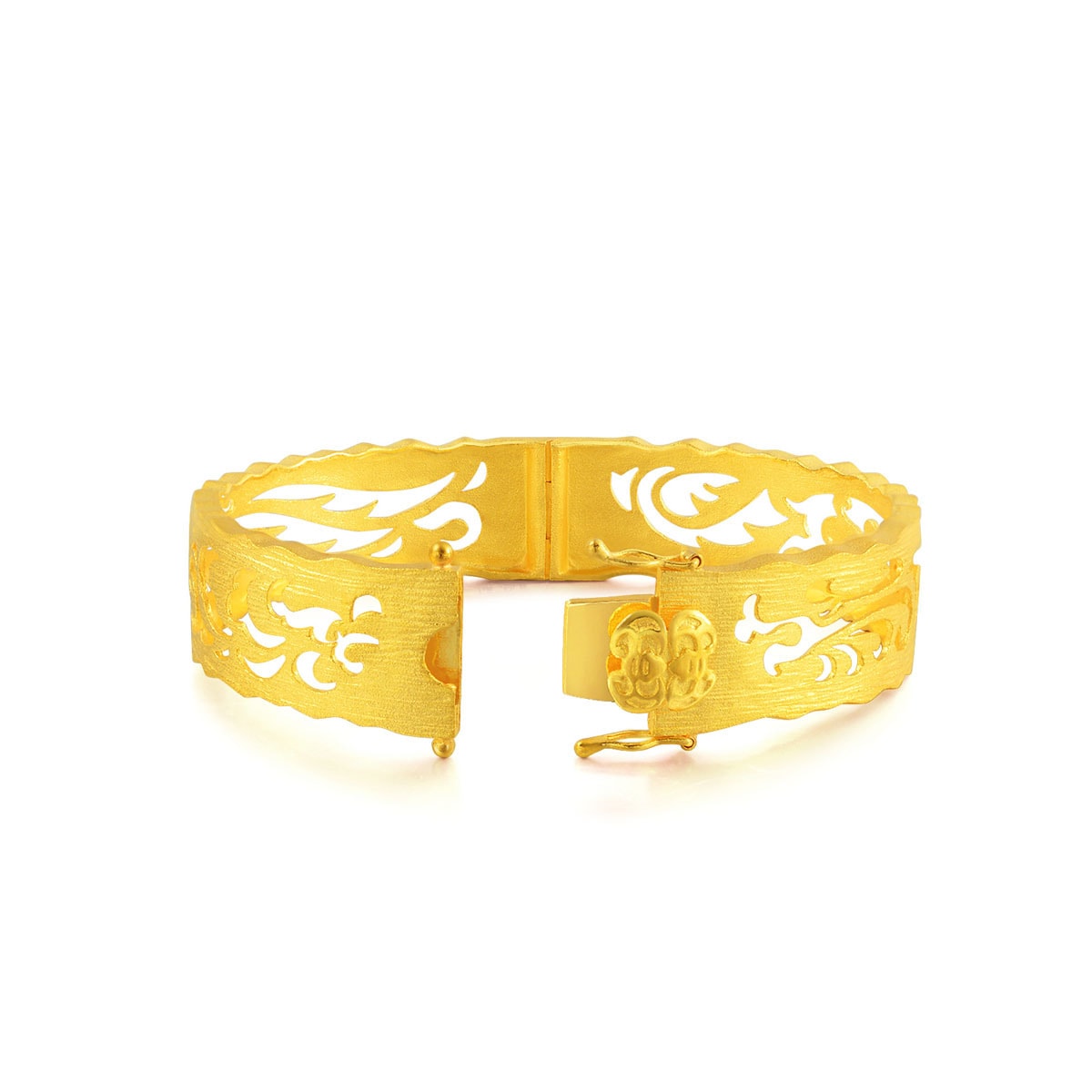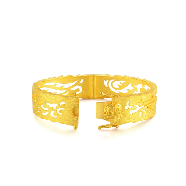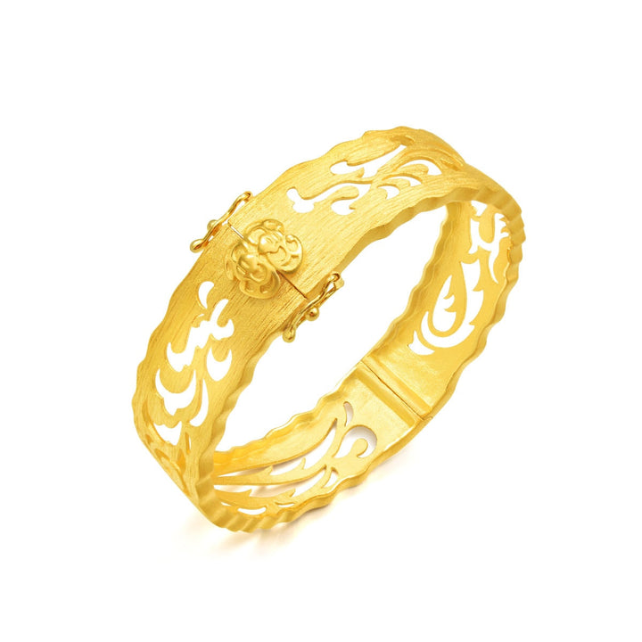 This 'Dragon & Phoenix' 999.9 Gold Bangle by Chow Sang Sang is an exquisite symbol of good luck and prosperity. With brushed finishing and a hollow design, this luxurious piece represents elegance and the blessings of a long and happy marriage.