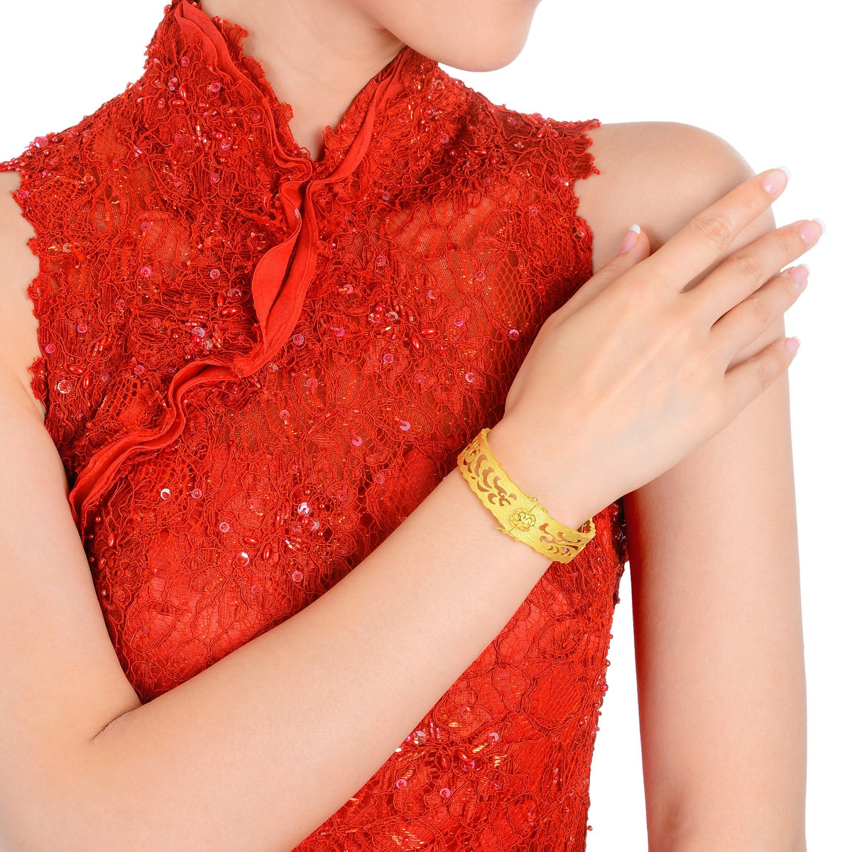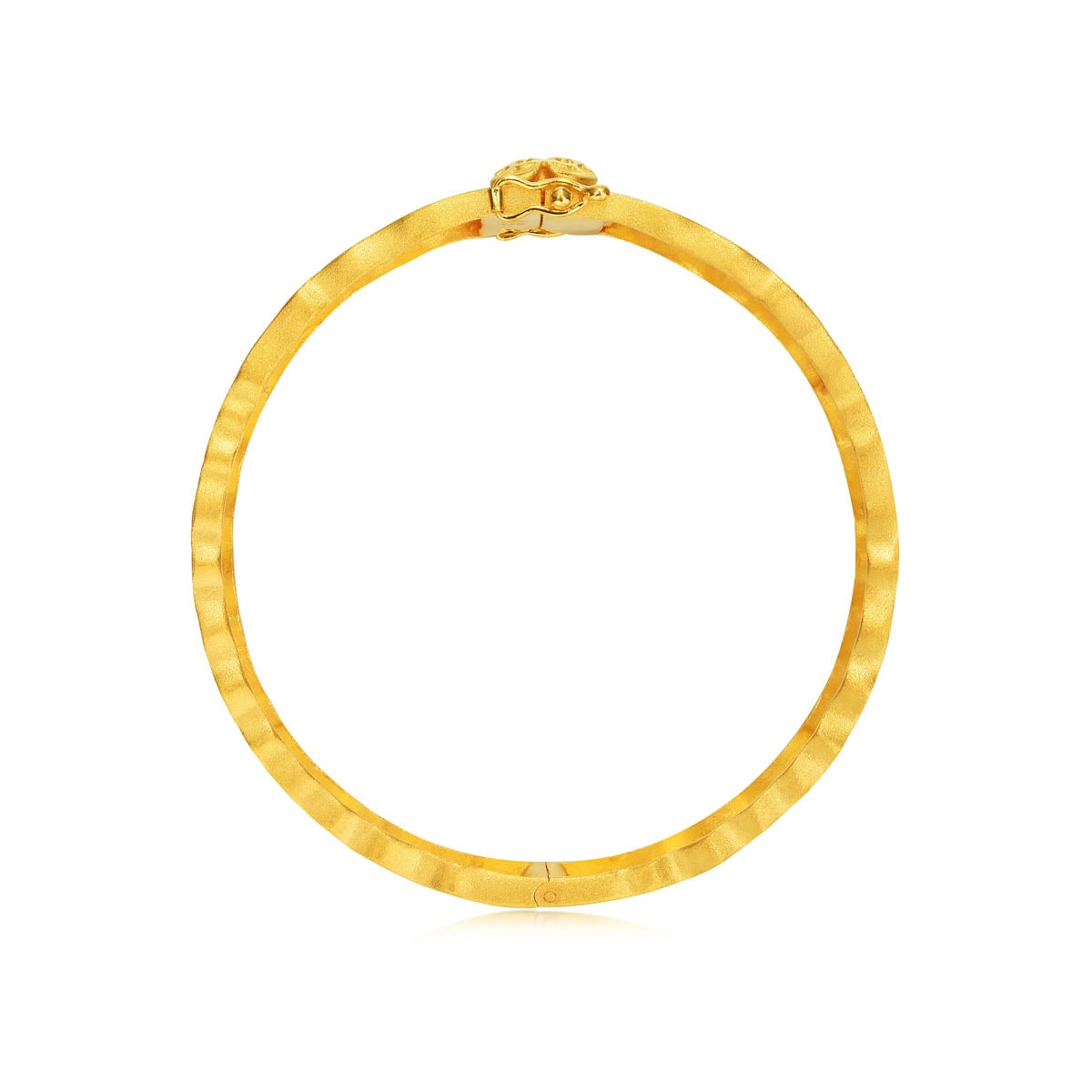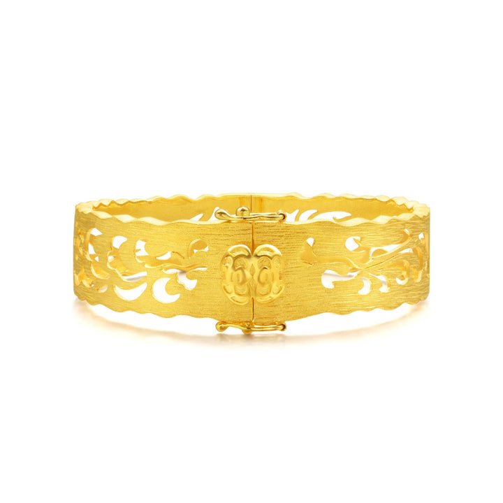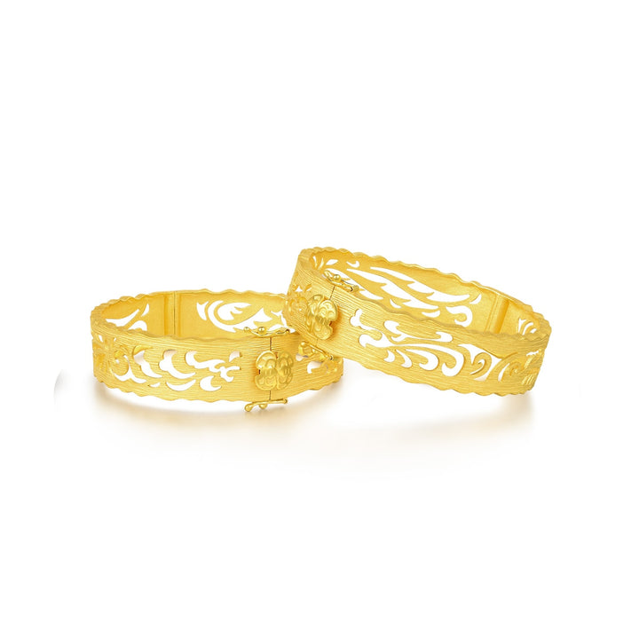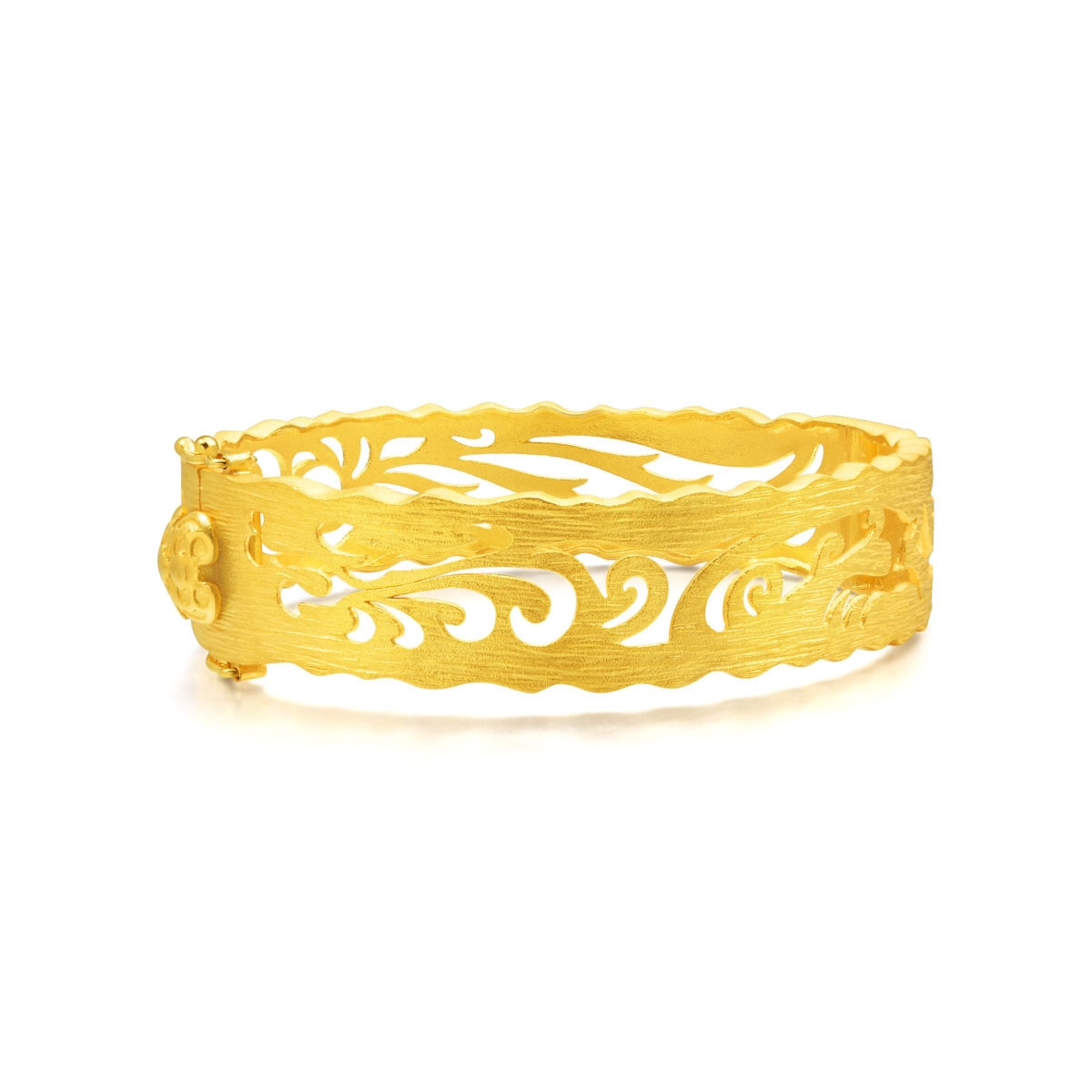 This 'Dragon & Phoenix' 999.9 Gold Bangle by Chow Sang Sang is an exquisite symbol of good luck and prosperity. With brushed finishing and a hollow design, this luxurious piece represents elegance and the blessings of a long and happy marriage.