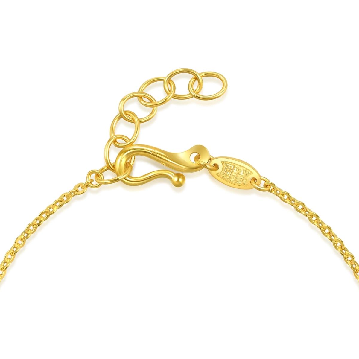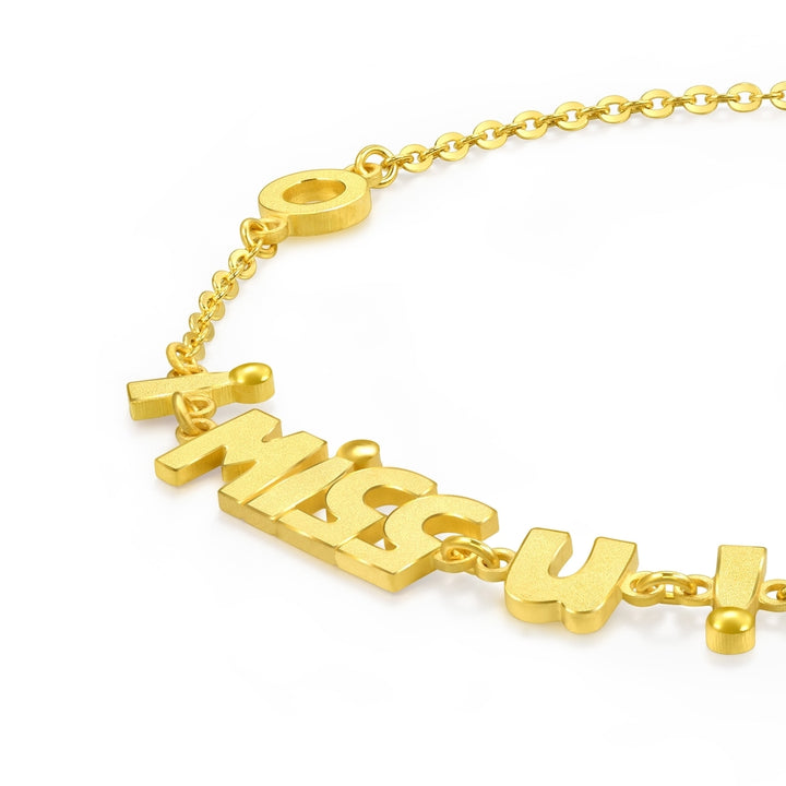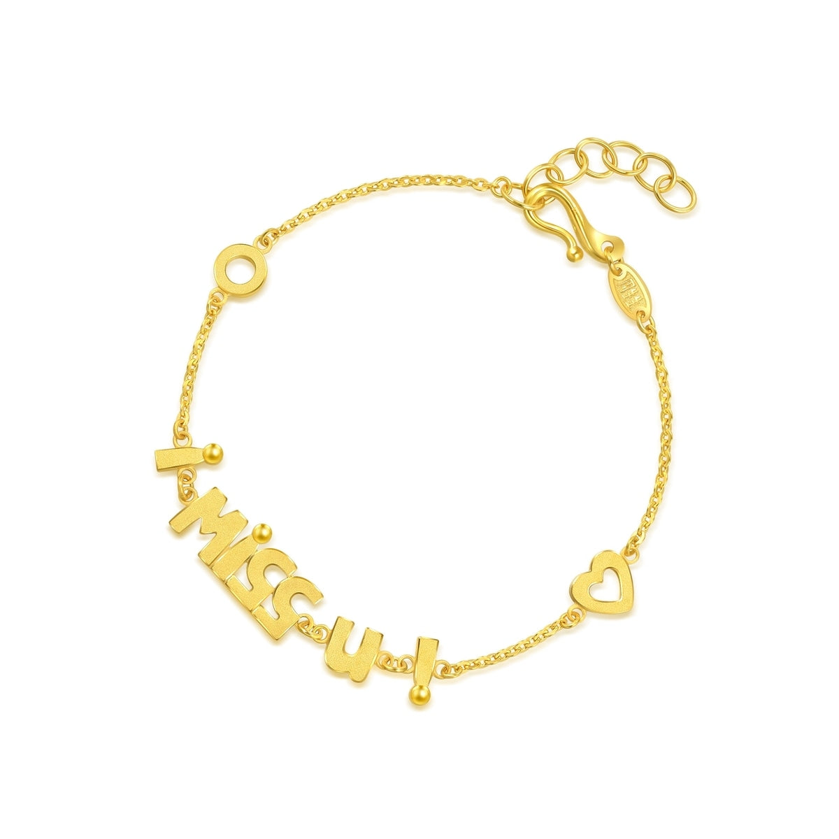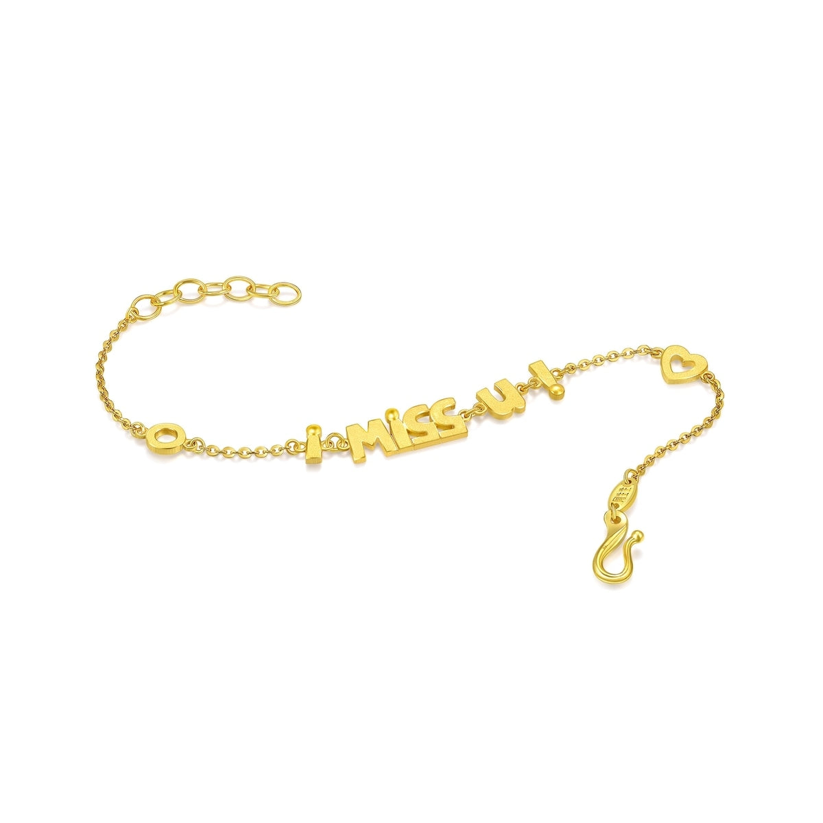 This 999.9 Gold Bracelet by Chow Sang Sang plays innovatively with the phrase 'i miss u' by flipping it upside down, adding a fun and humble expression to the design. A playful way to express your feelings.