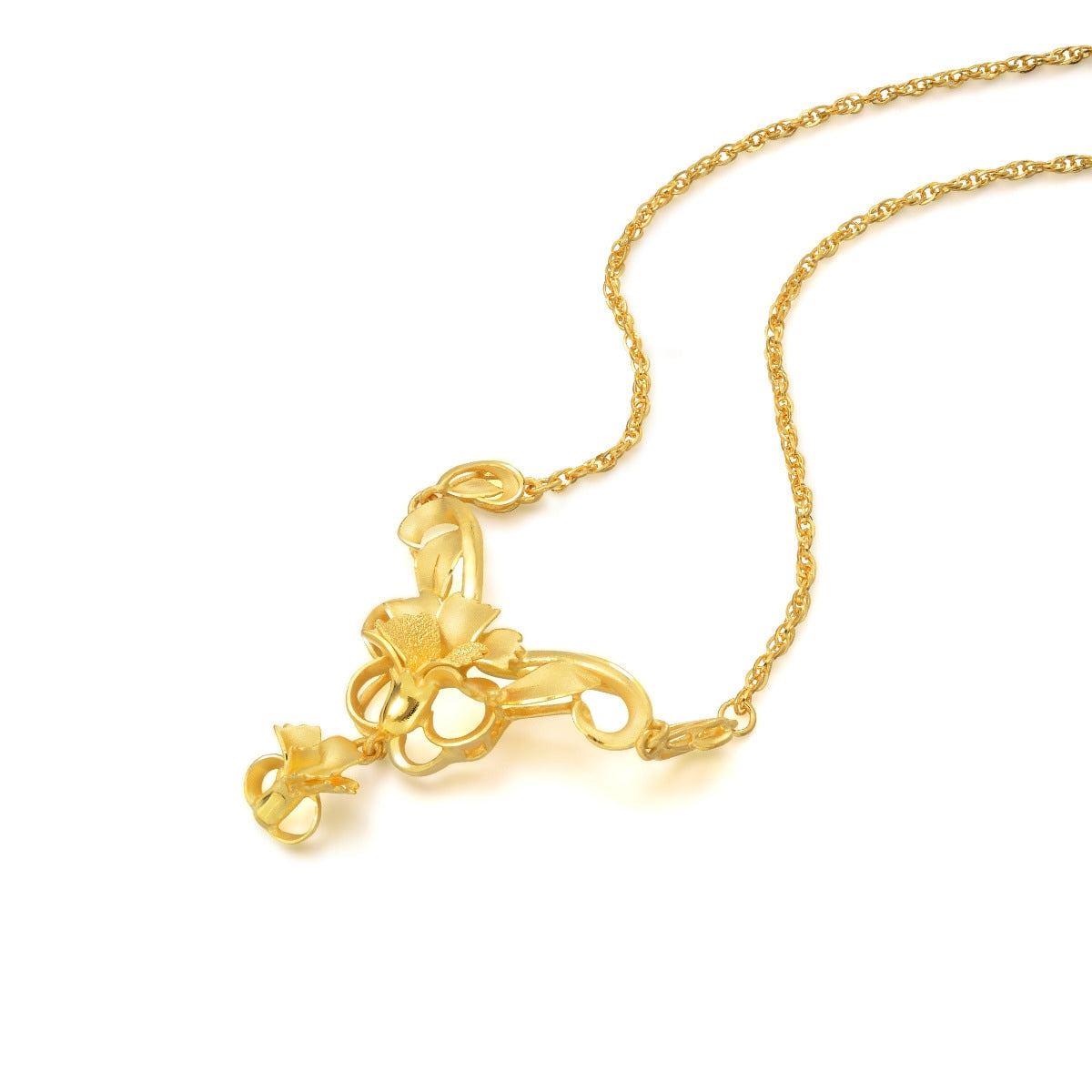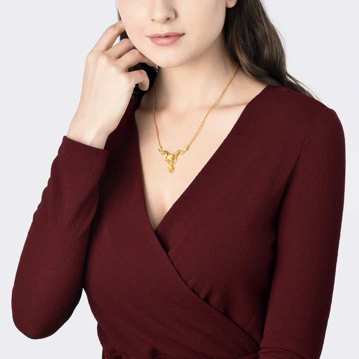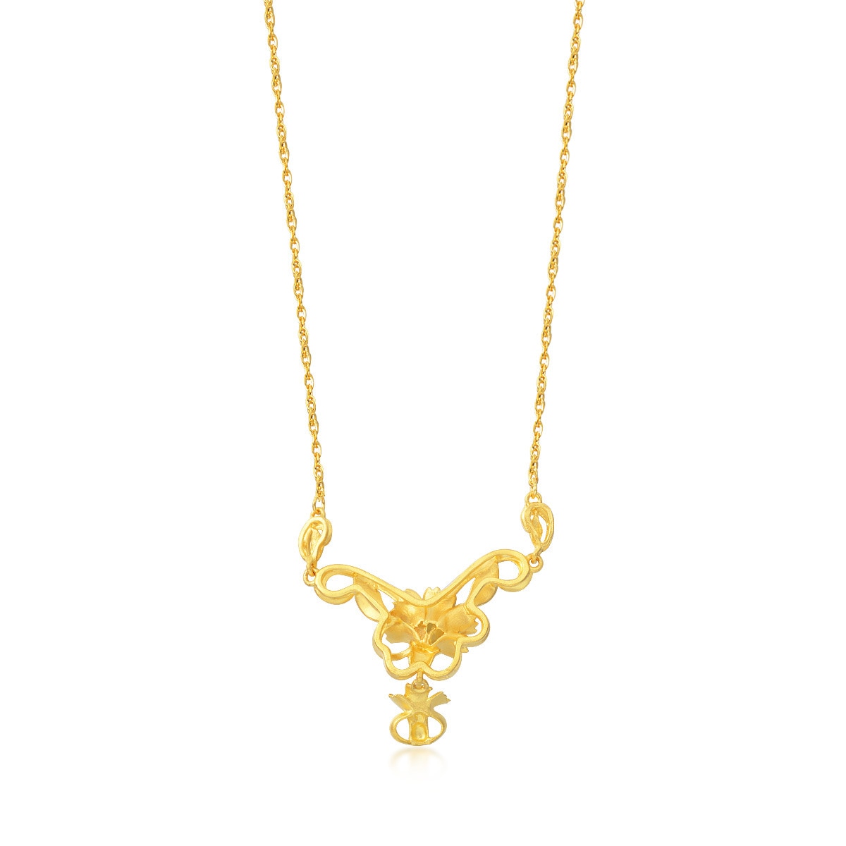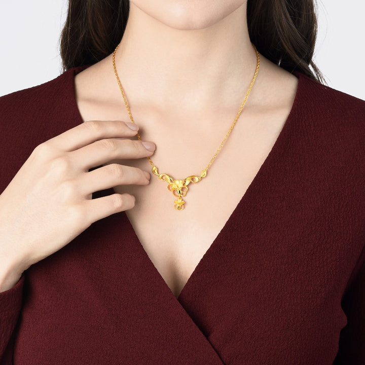 This 999.9 Gold Necklace by Chow Sang Sang showcases a luminous floral design with a mix of shiny and sandblasted surfaces, creating a captivating and elegant piece.