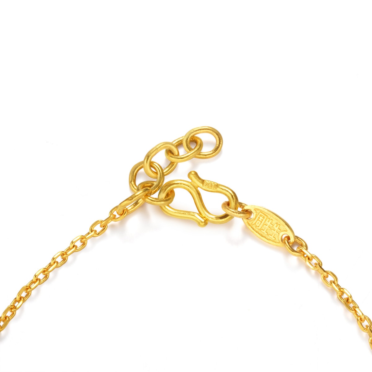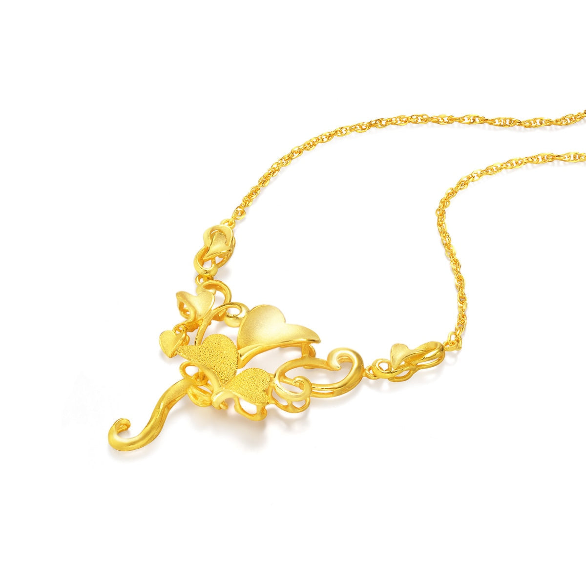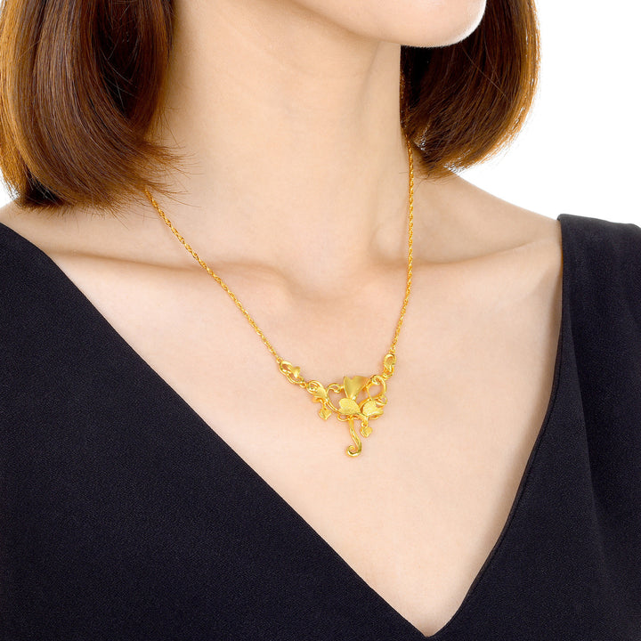 This 999.9 Gold Necklace by Chow Sang Sang features a refined design with delicate vines twirled around hearts, symbolizing love and connection.