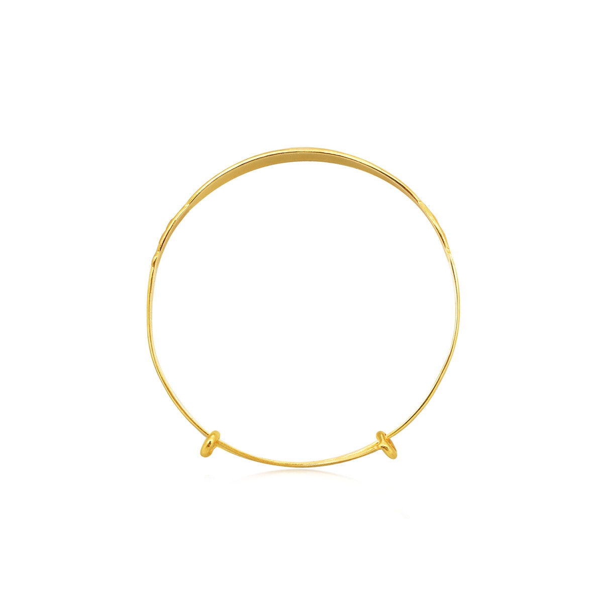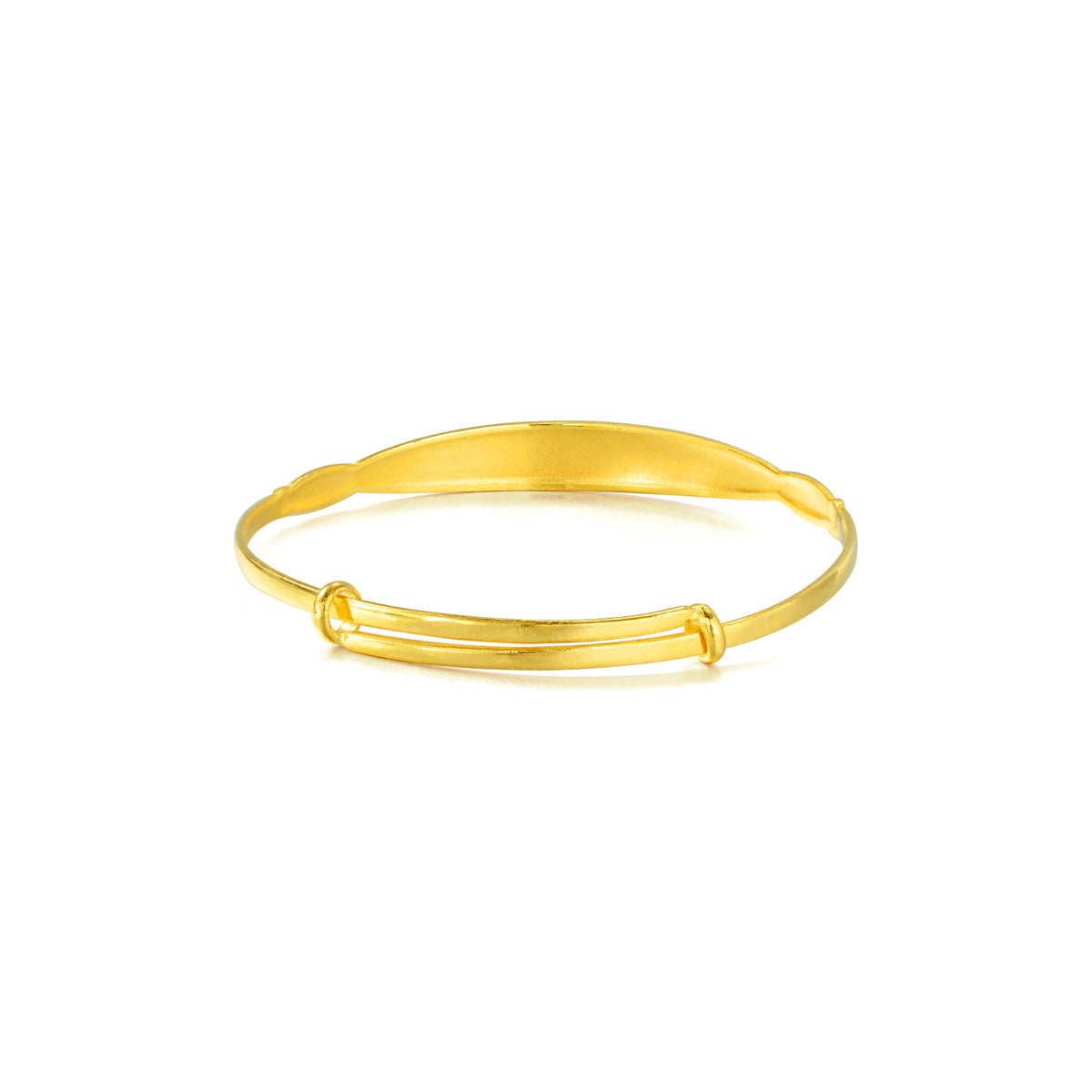 This 'New Born' 999.9 Gold Fortune Baby Bangle by Chow Sang Sang is a flat and adjustable piece, engraved with the Chinese character「福」, representing good fortune. The diameter can be adjusted from 45mm to 55mm, making it ideal for growing babies.