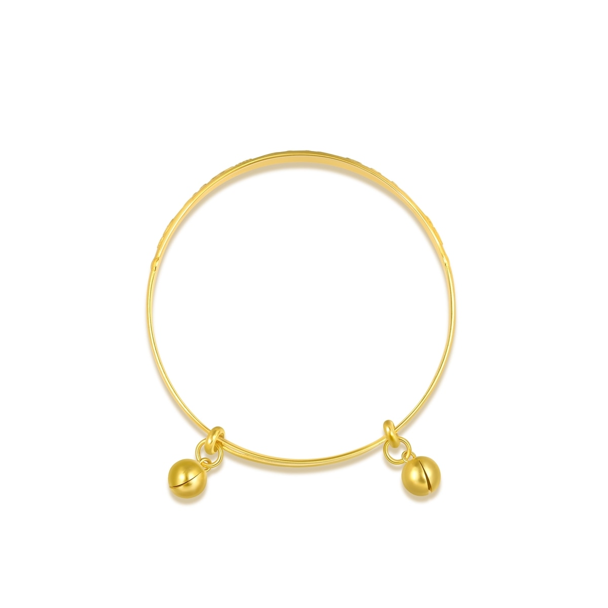 This 'New Born' Longevity Baby Bangle with Bells by Chow Sang Sang is engraved with the Chinese characters 「長命富貴」, symbolizing wishes for longevity and wealth. The adjustable bangle’s diameter ranges from 44mm to 54mm.