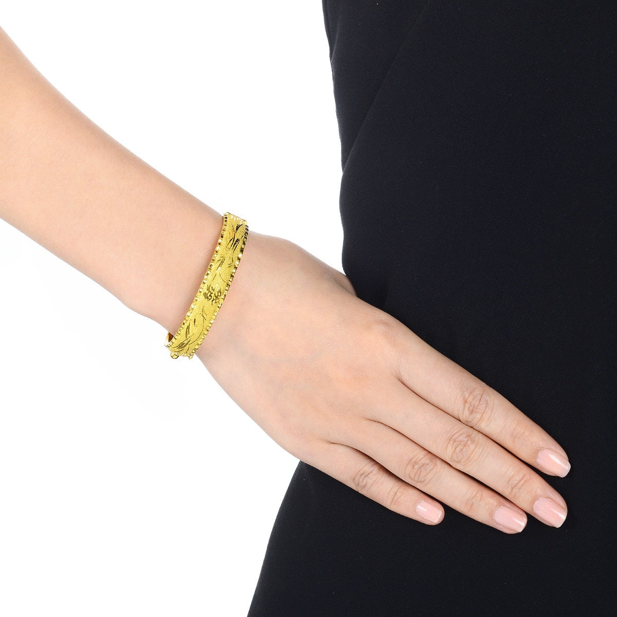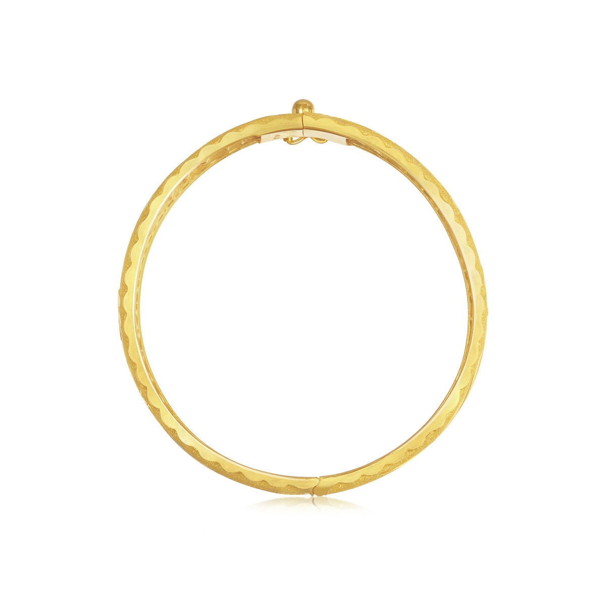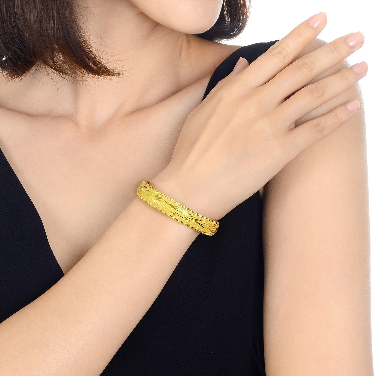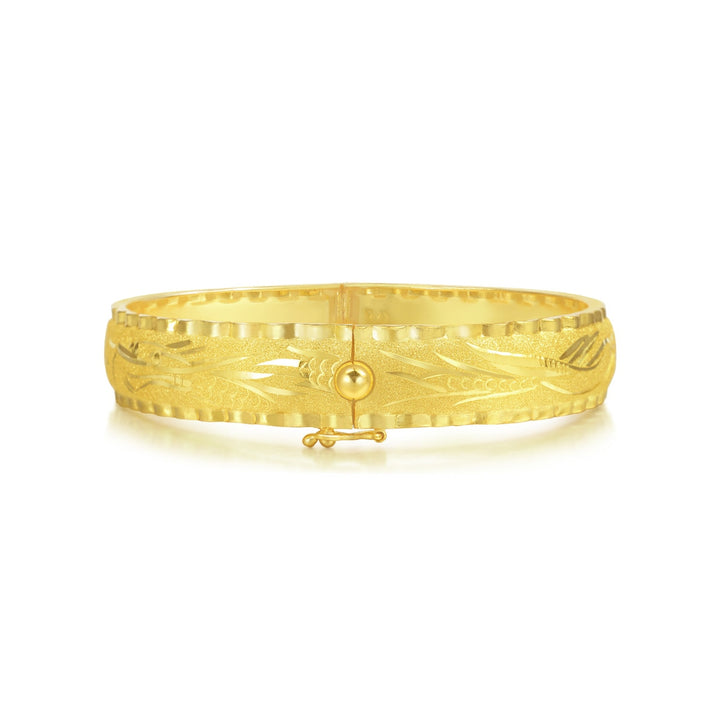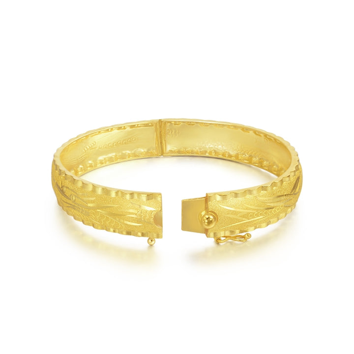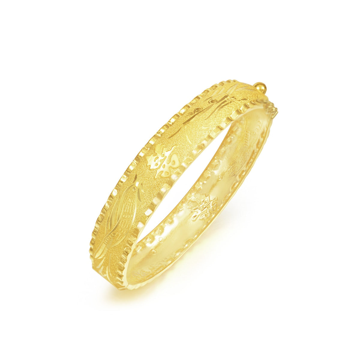 This 'Dragon & Phoenix' 999.9 Gold Bangle by Chow Sang Sang is sophisticatedly crafted with splendid engravings of the dragon, phoenix, and double-happiness character, symbolizing a long and happy marriage. A meaningful gift to express sincere blessings.