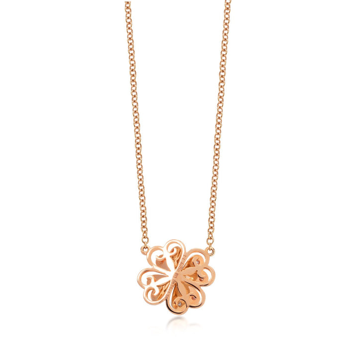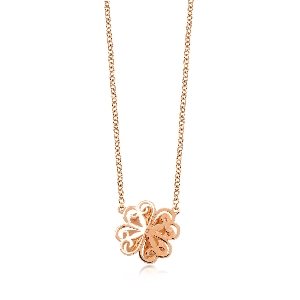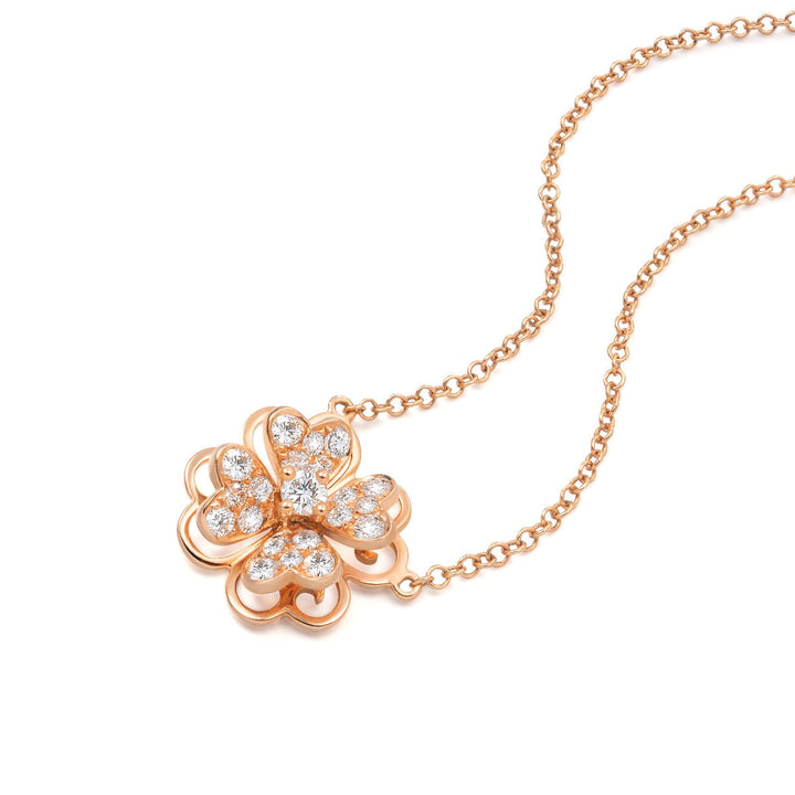 This 18K Rose Gold Diamond Necklace by Chow Sang Sang features a classic lucky clover design, adorned with sparkling diamonds that bring good fortune and elegance to any occasion.