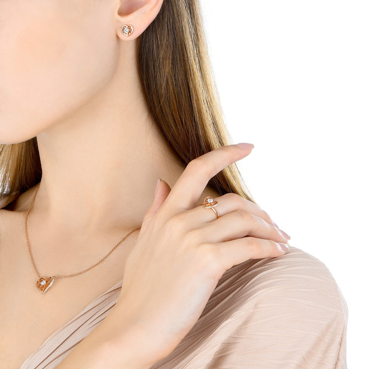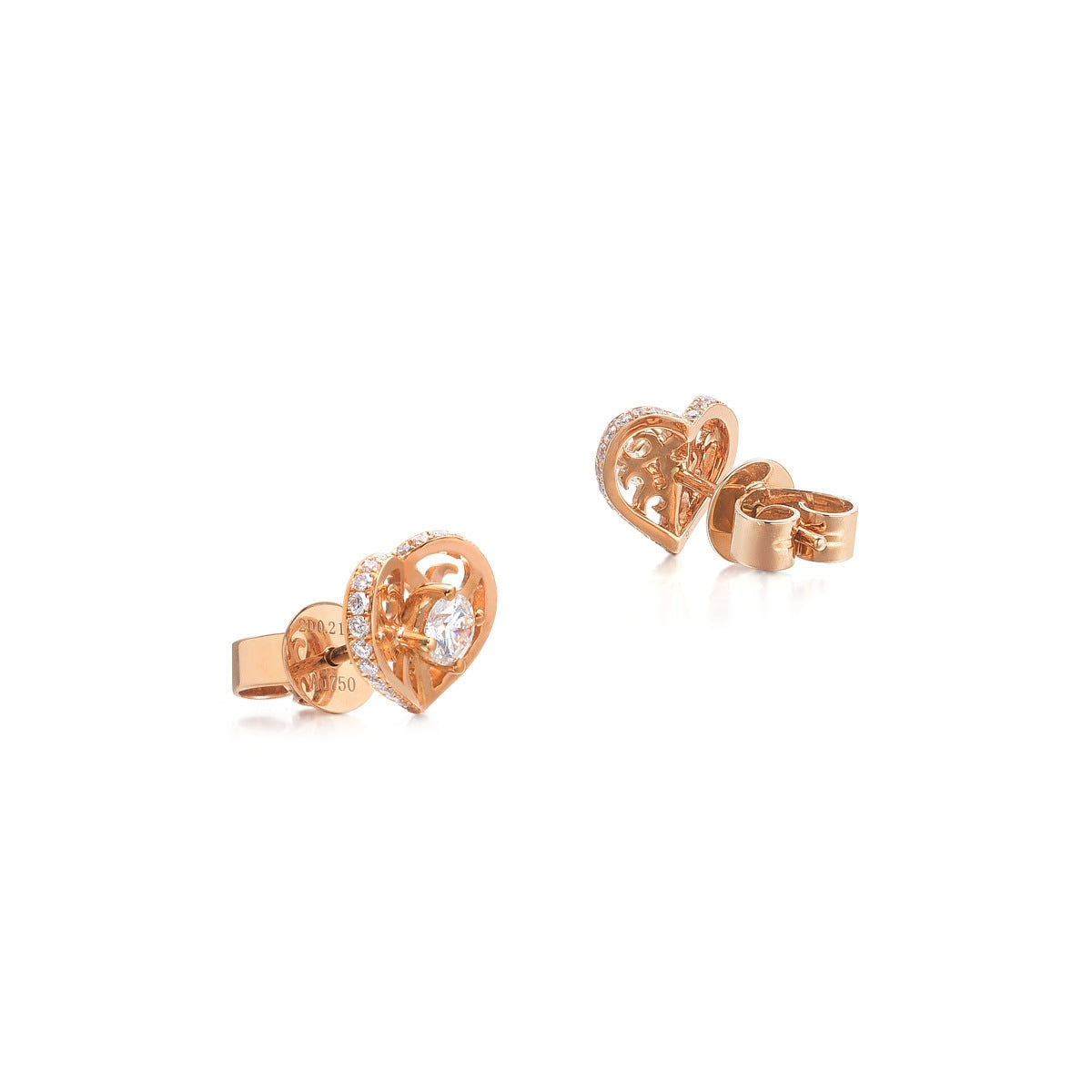 These 18K Red Gold Diamond Heart Earrings by Chow Sang Sang feature a classic heart design, intricately carved with unique lace patterns. The diamonds highlight the main gem's splendor, making this piece a stunning expression of elegance.