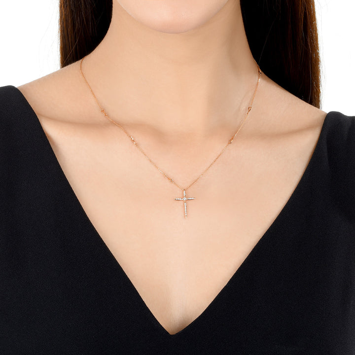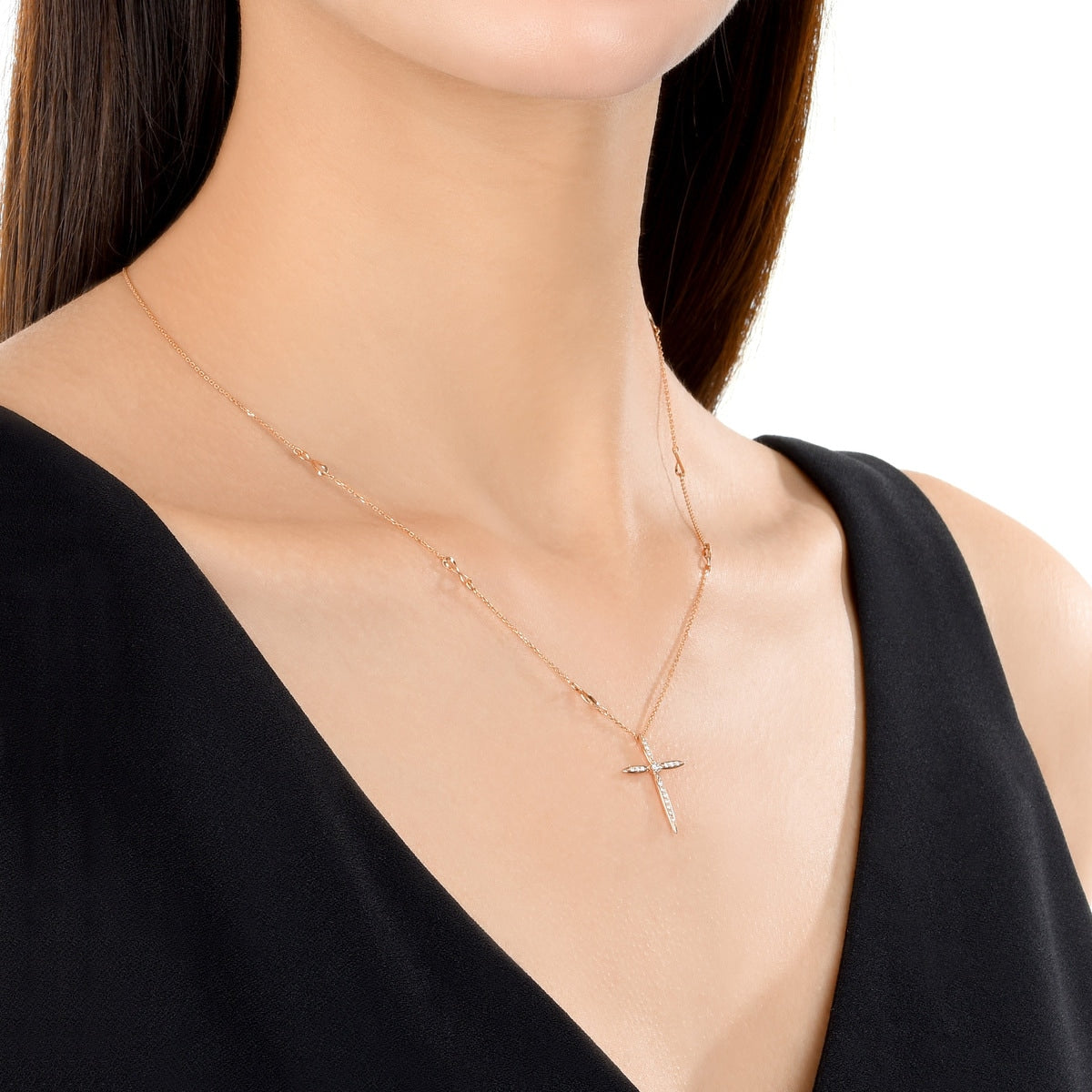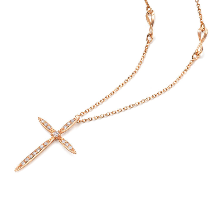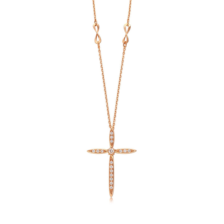 This 18K Red Gold Diamond Cross Necklace by Chow Sang Sang is a refined and sophisticated design. The rose gold cross is delicately embellished with sparkling diamonds, adding a touch of elegance to the piece.