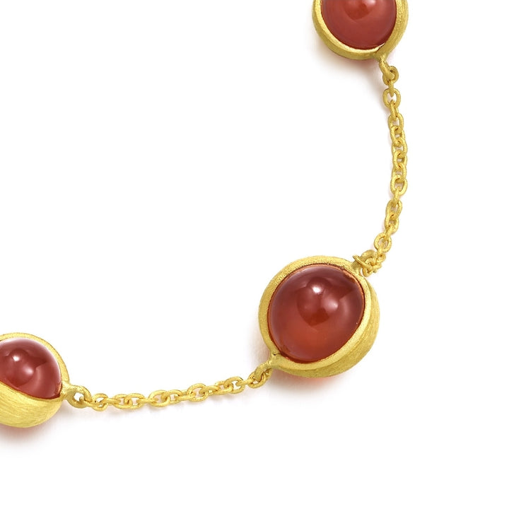 This 999.9 Gold Bracelet by Chow Sang Sang features a central circle motif, embodying the endless grace and strength of the modern woman. The brushed texture of the gold contrasts beautifully with the red agate encased within, making this piece a perfect feminine accessory for any occasion.