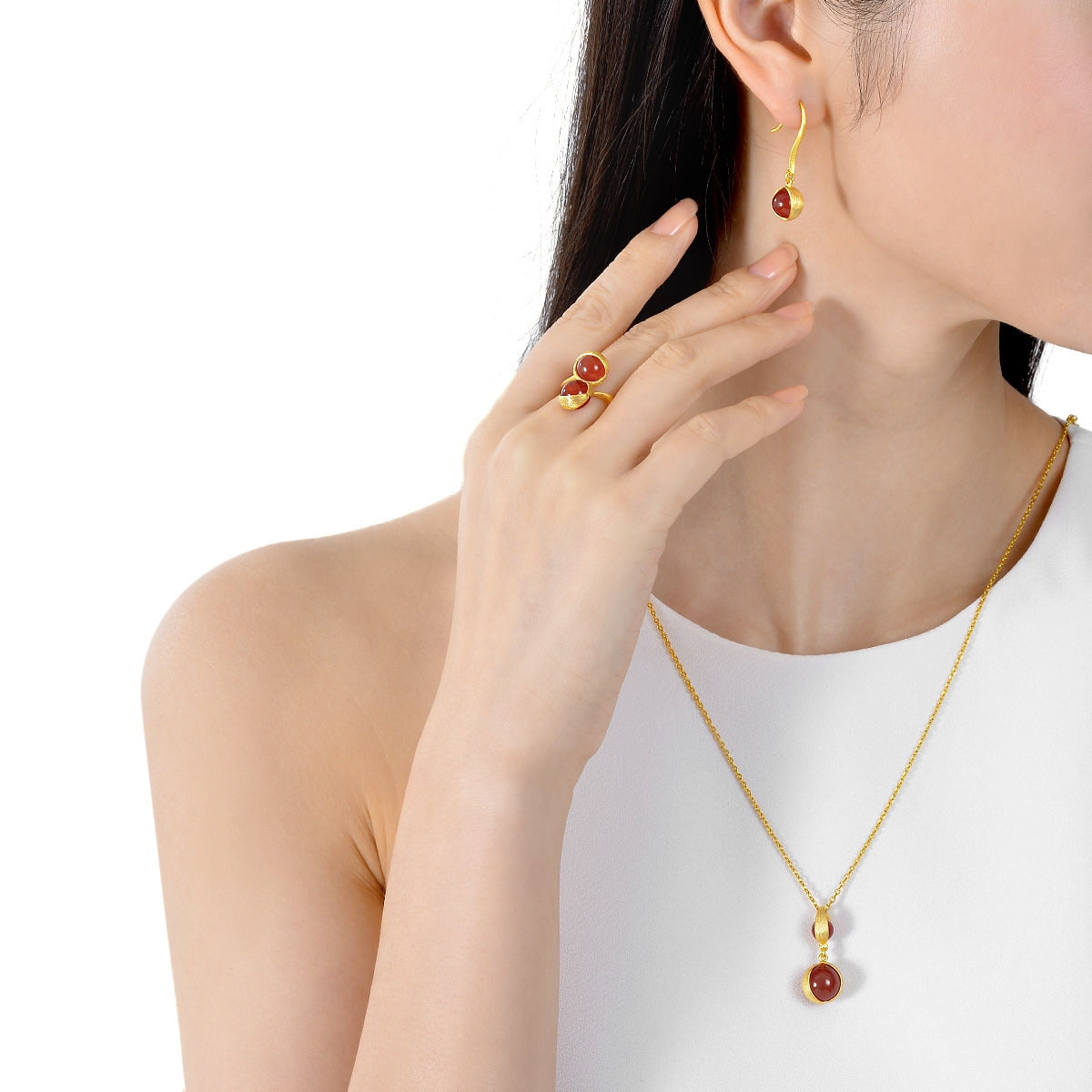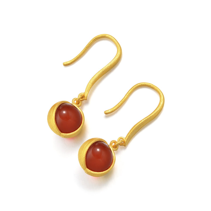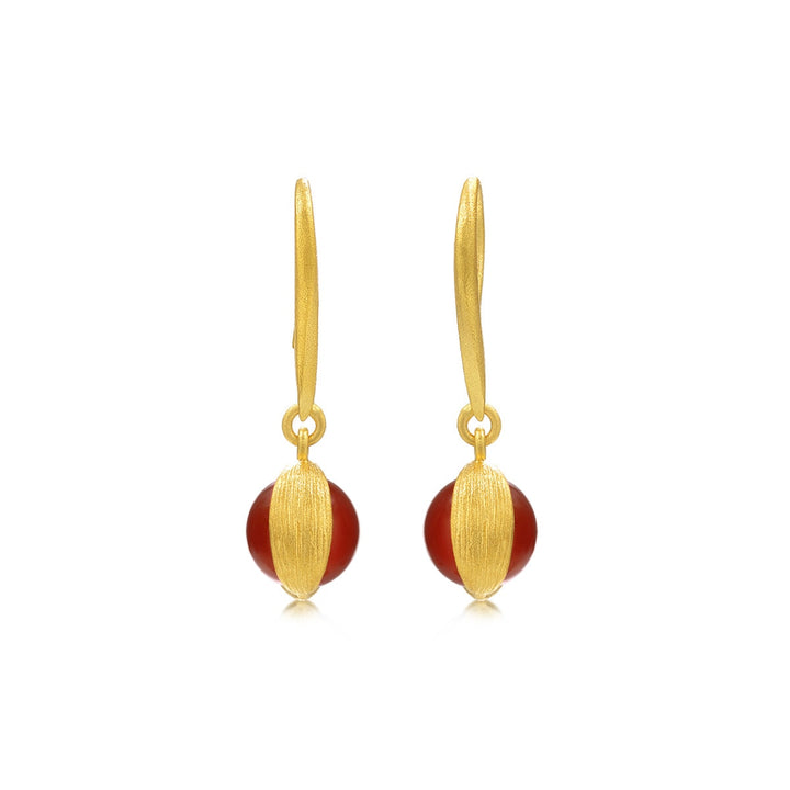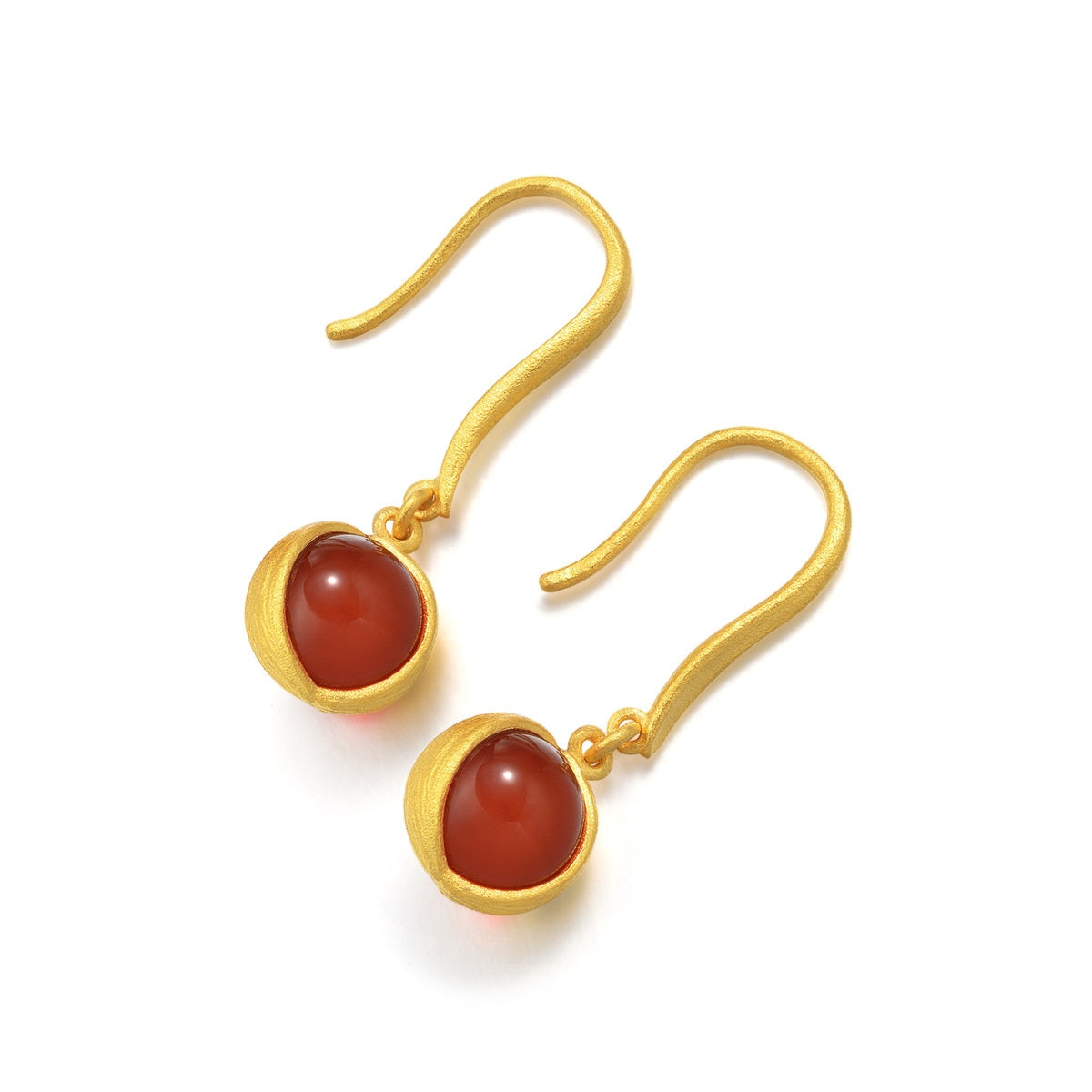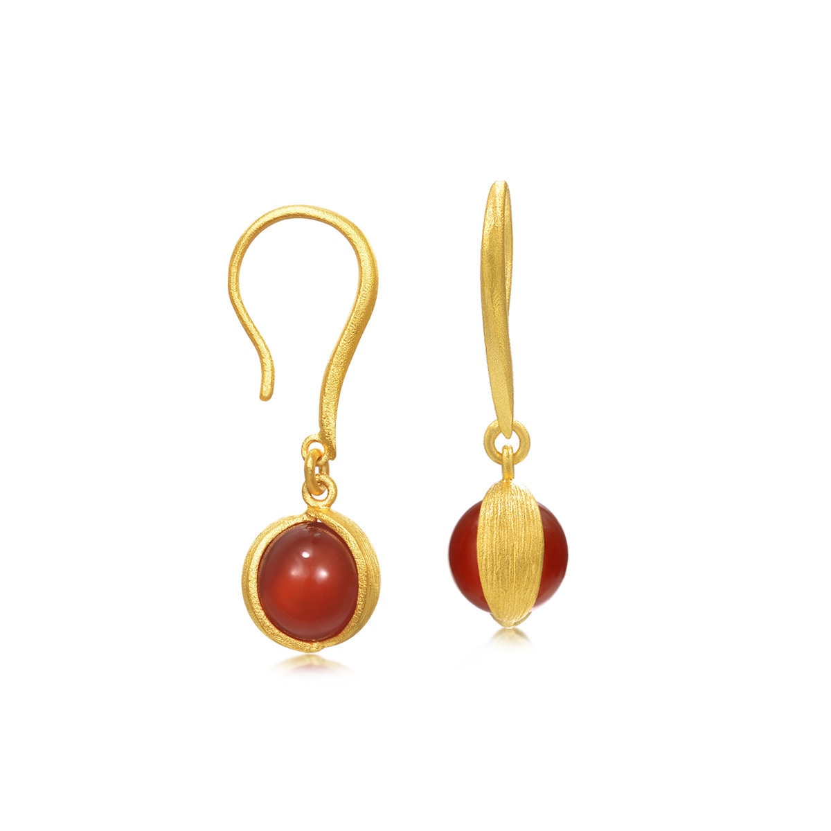 These 999.9 Gold Earrings by Chow Sang Sang are inspired by the circle, symbolizing grace and strength. The brushed gold and red agate create a striking contrast that catches the light with each movement, making these earrings perfect for daily wear and adding a touch of elegance to any outfit.