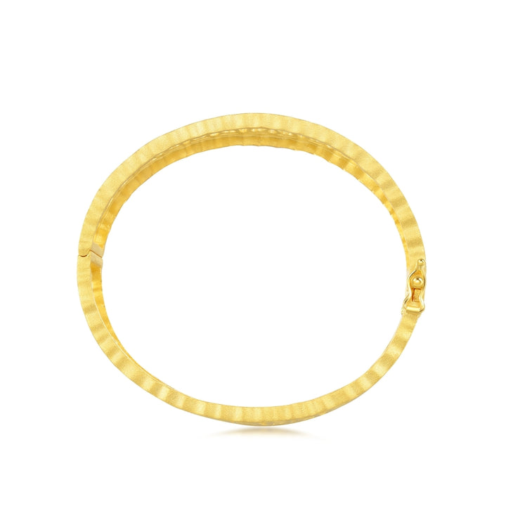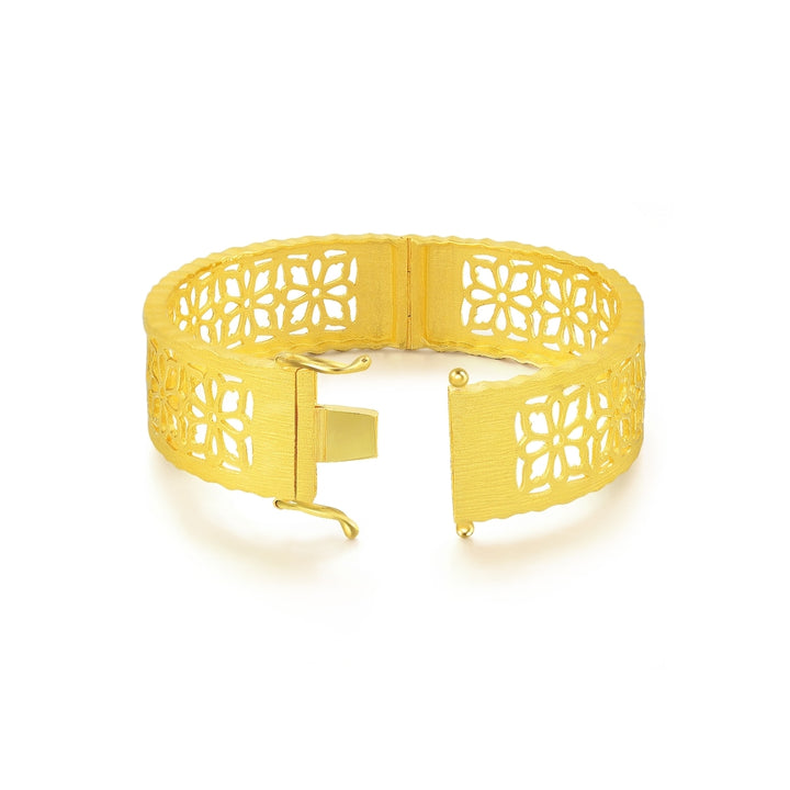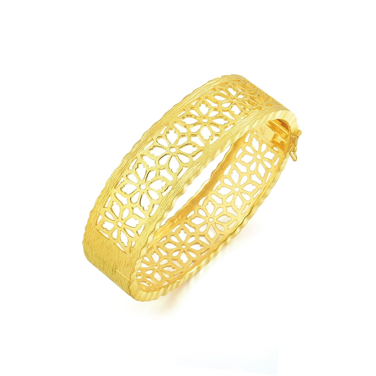 This Blossom 999.9 Gold Bangle by Chow Sang Sang is inspired by the Gesar flower, also known as “snowbaby,” symbolizing happiness and luck. The hollow carvings of the flower add a modern artistic touch to this minimalist design, bringing blessings and a sense of contentment to its wearer.
