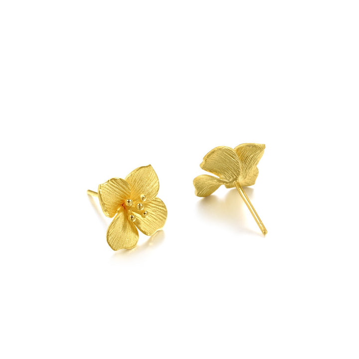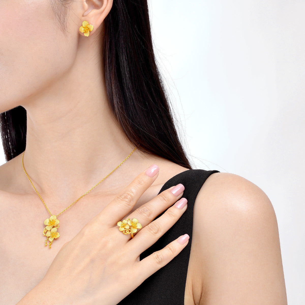 These 999.9 Gold Earrings by Chow Sang Sang are delicately carved into hydrangea flowers, with layered petals that bring the floral design to life. The intricate craftsmanship gives these earrings a soft, feminine allure, making them a beautiful statement of nature-inspired elegance.
