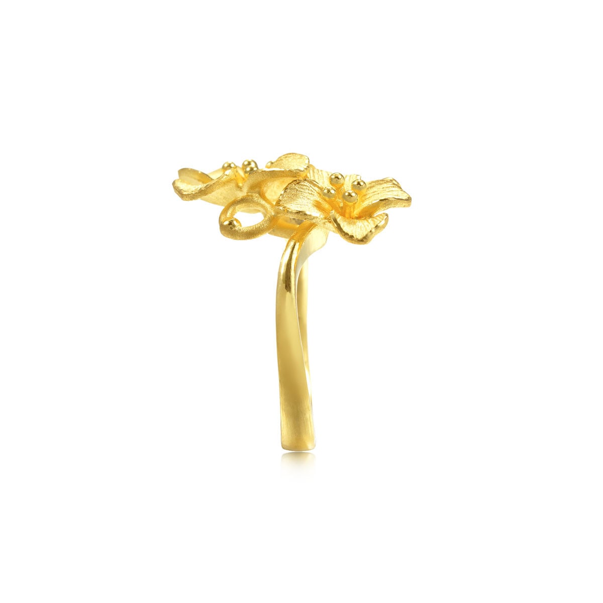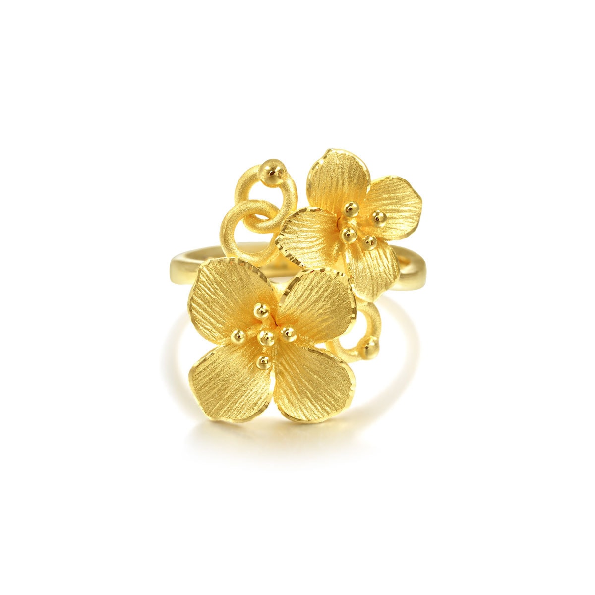 This 999.9 Gold Ring by Chow Sang Sang features a bouquet of hydrangeas elegantly positioned on the ring’s surface. The bold floral design emphasizes the beauty of the flowers, creating a striking piece that adds a touch of nature’s charm to your style.