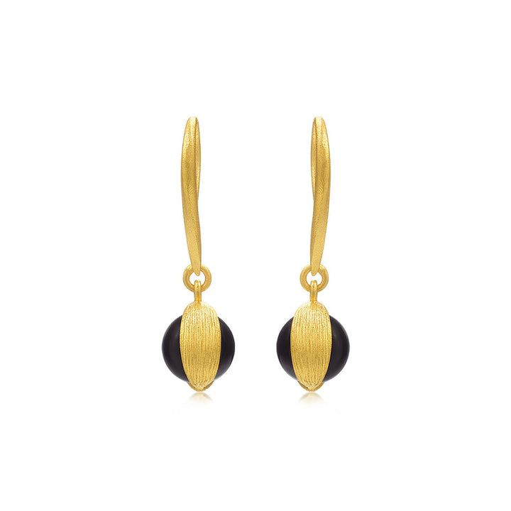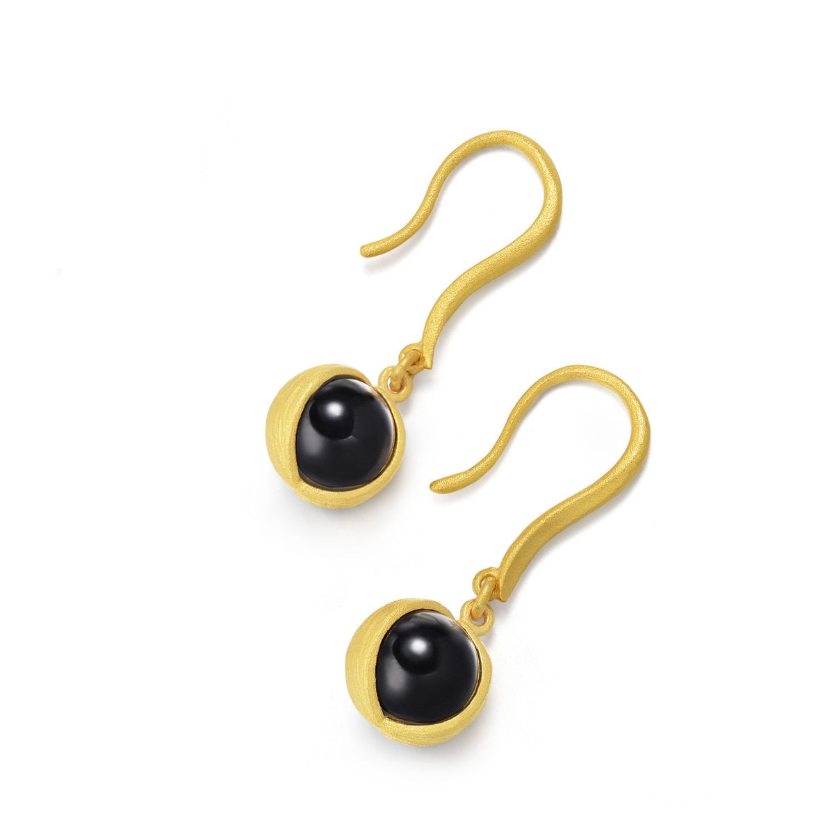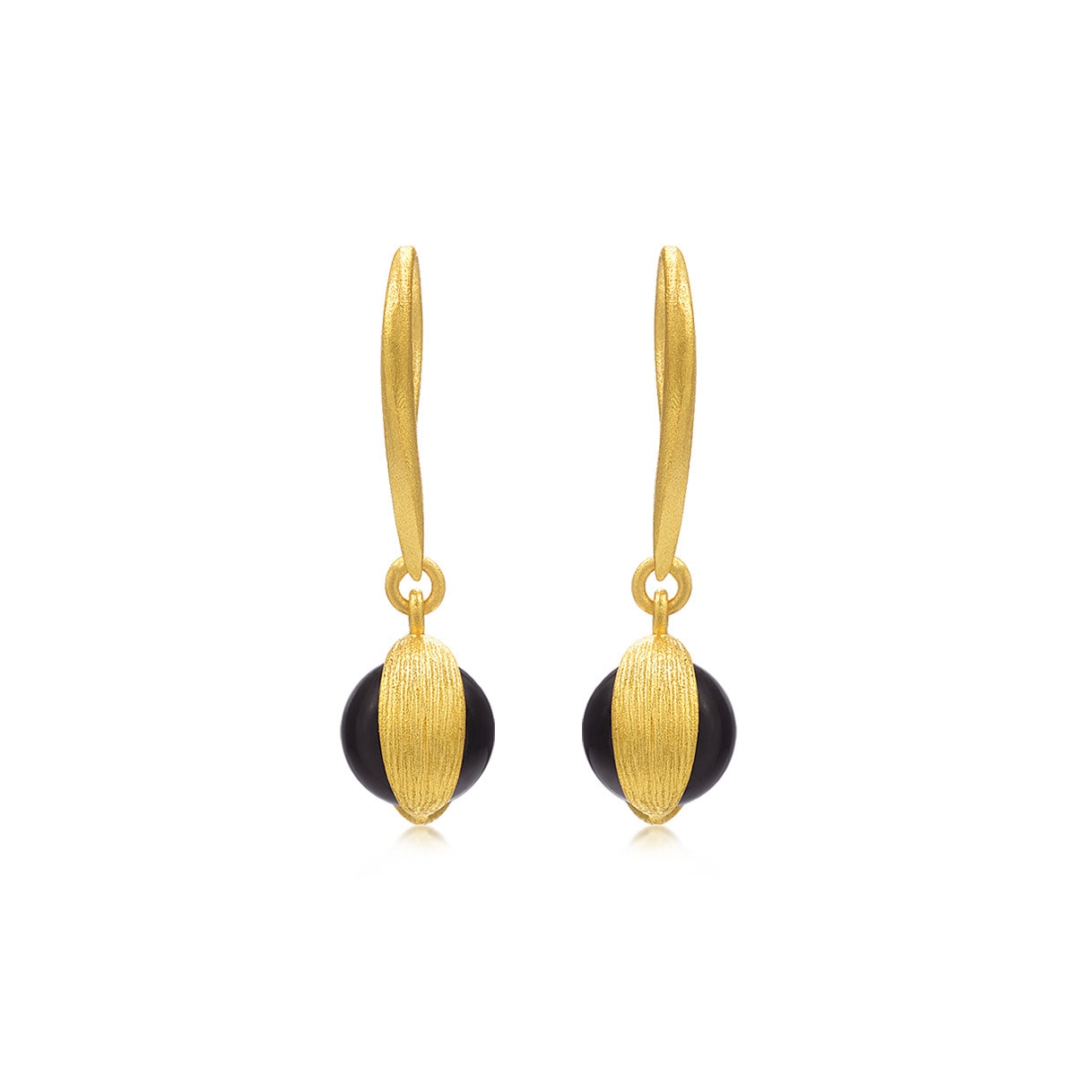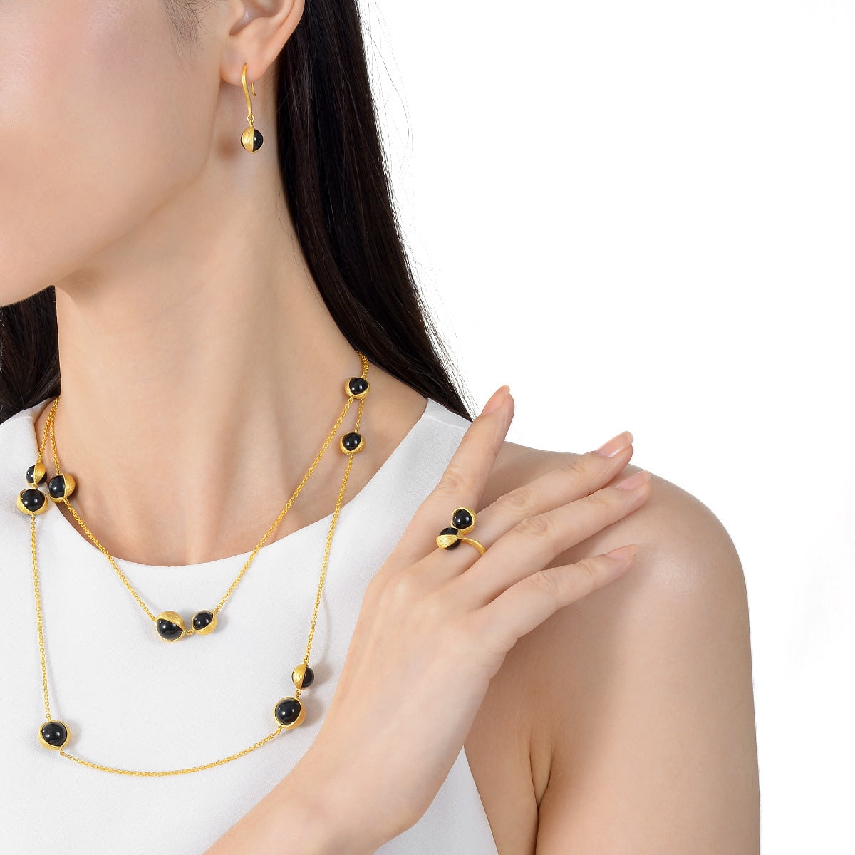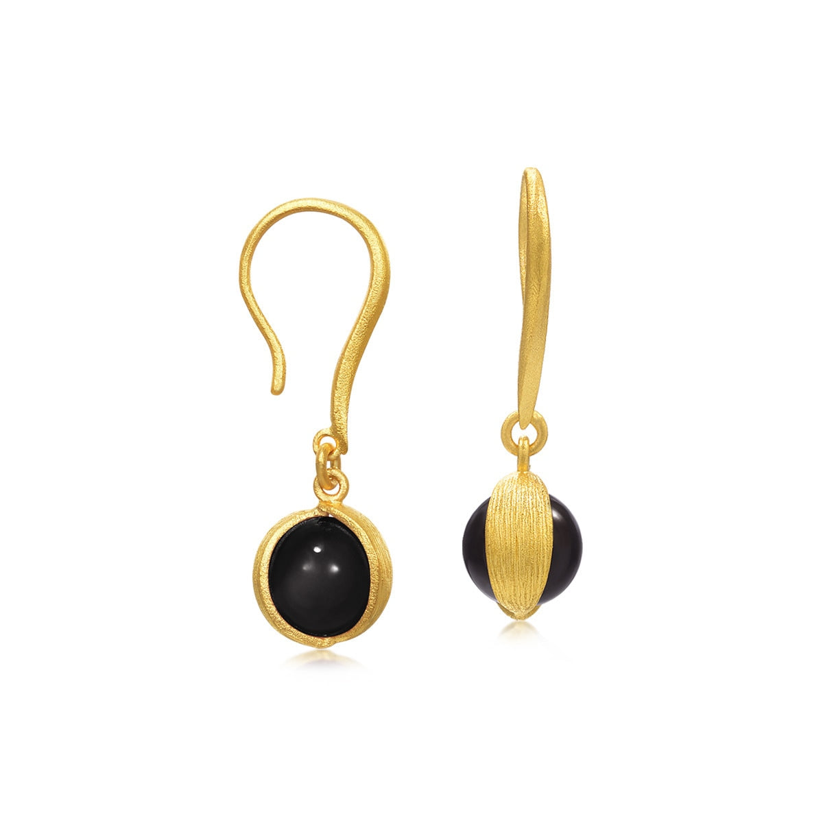 These 999.9 Gold Earrings by Chow Sang Sang are inspired by the circle, symbolizing the balance of grace and strength. The brushed gold contrasts elegantly with black chalcedony, creating an alluring set of earrings that sway gracefully with every movement. Perfect for everyday work wear, these earrings combine timeless elegance with modern sophistication.