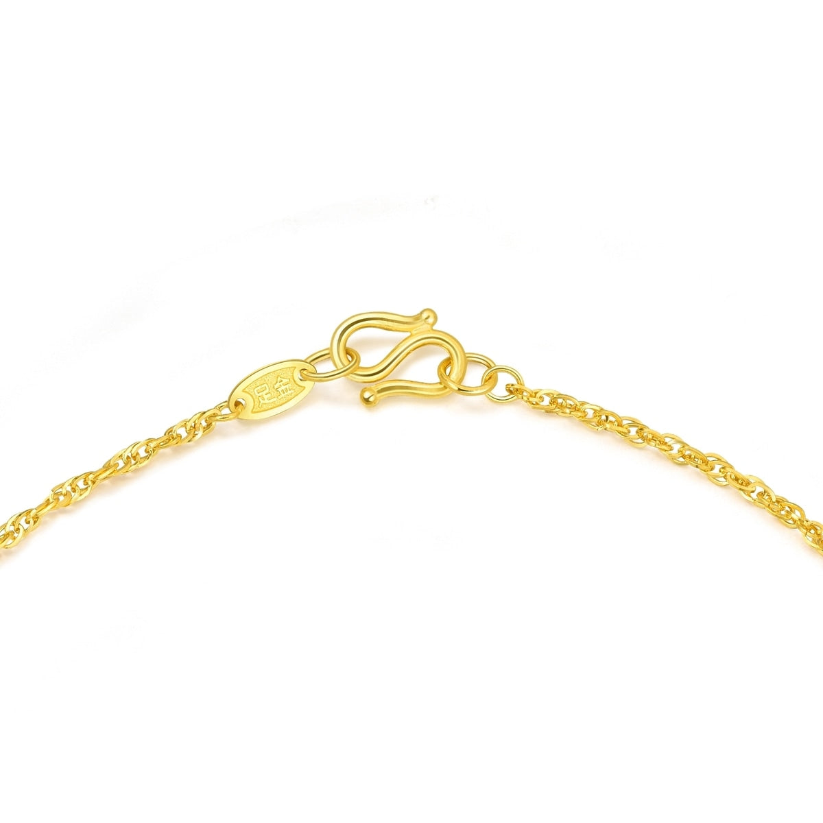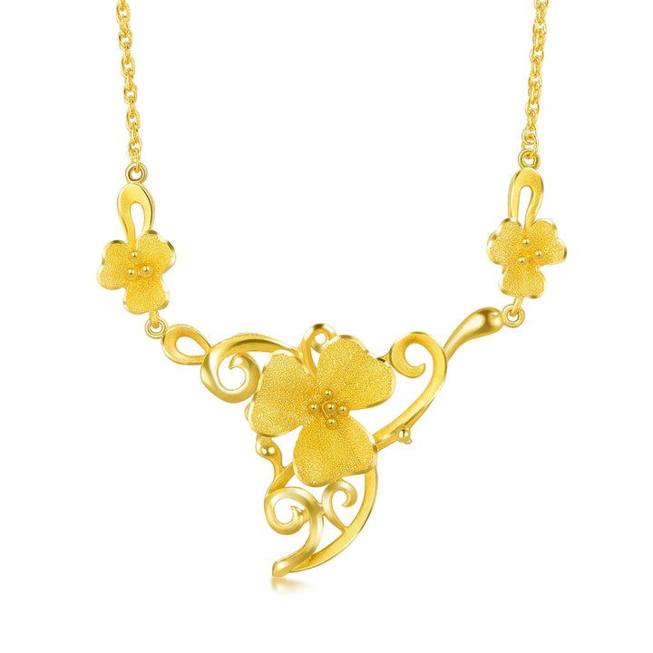 This 999.9 Gold Necklace by Chow Sang Sang is adorned with blooming flowers, symbolizing prosperity and good fortune. This necklace reflects a wish for lifelong happiness and serves as a beautiful and meaningful accessory for any occasion.