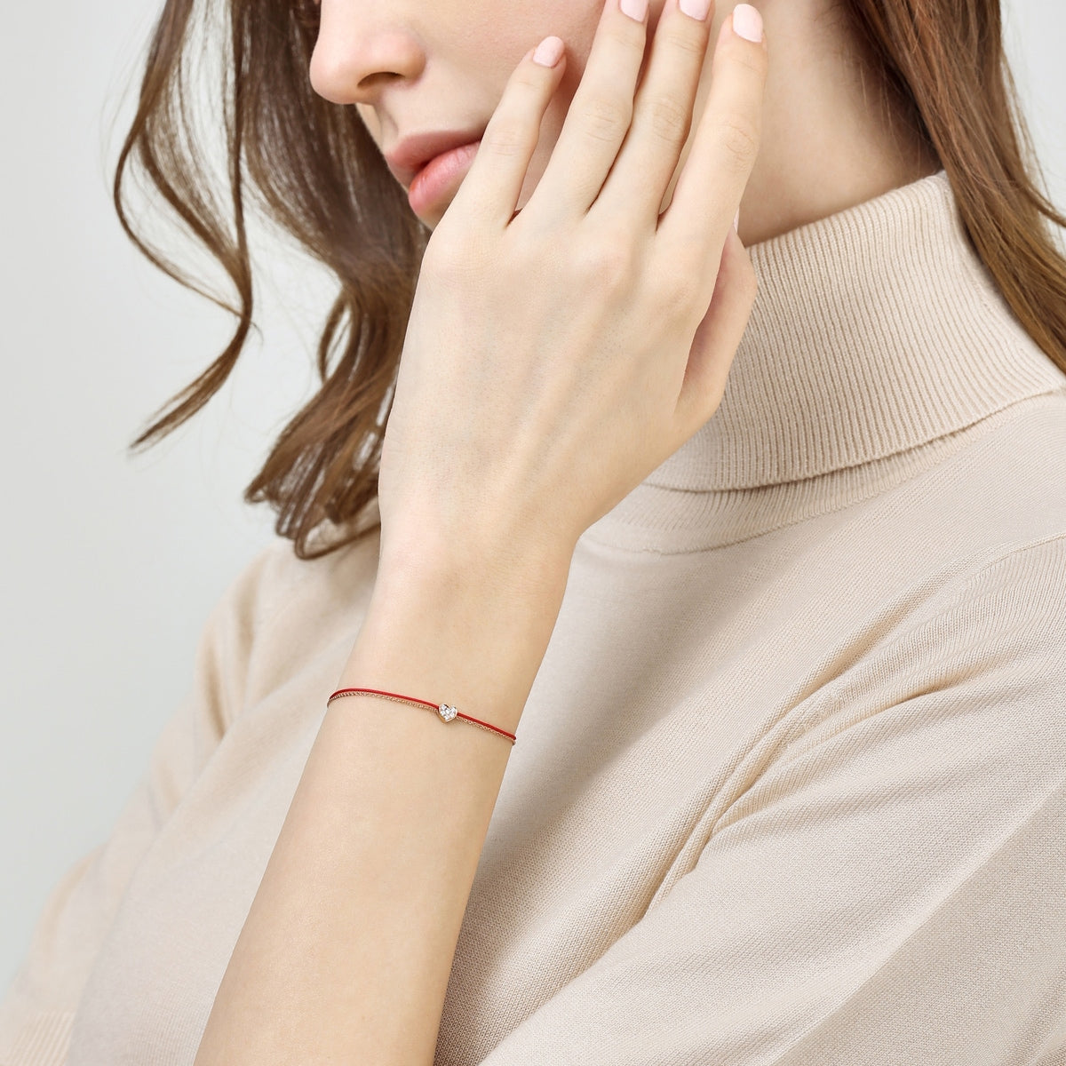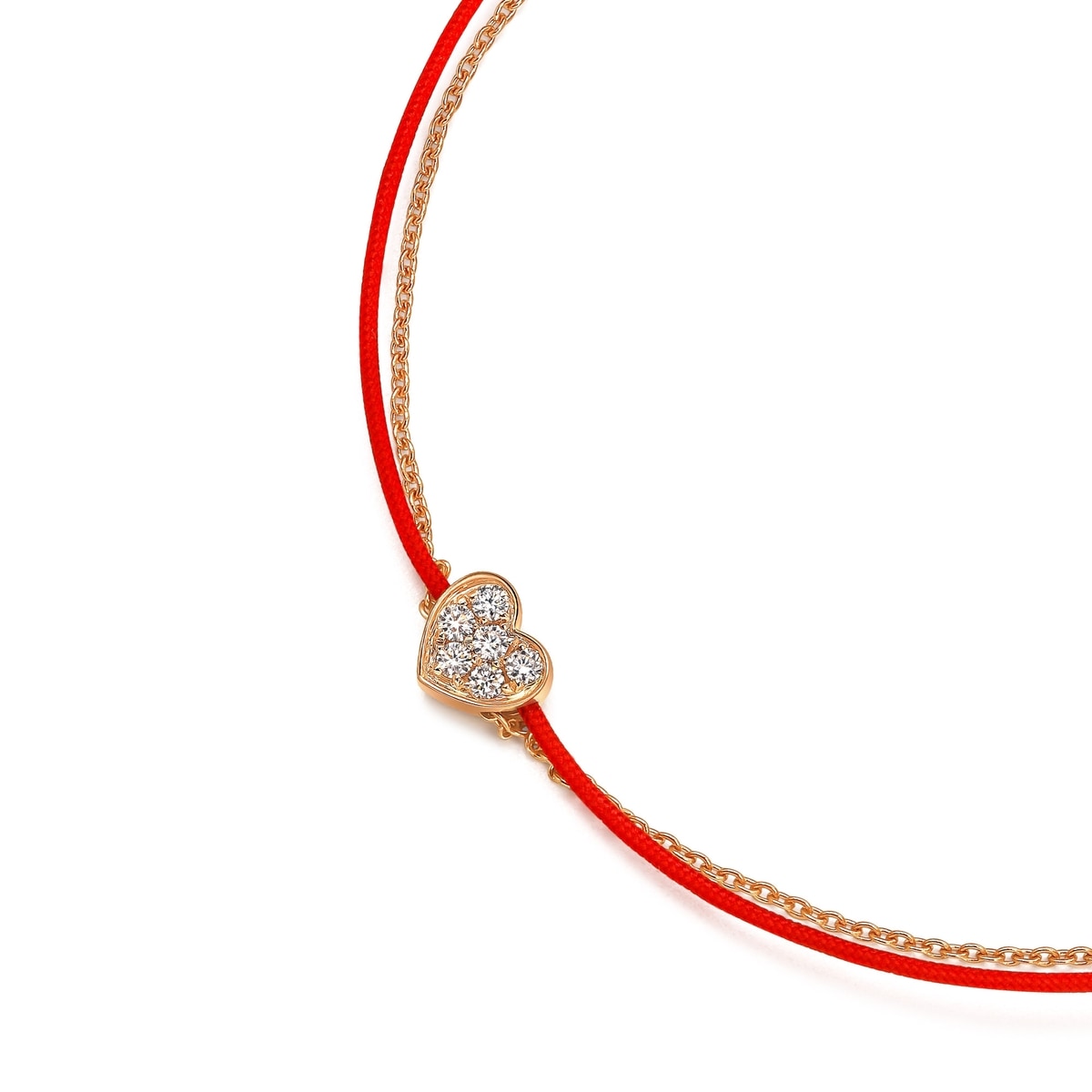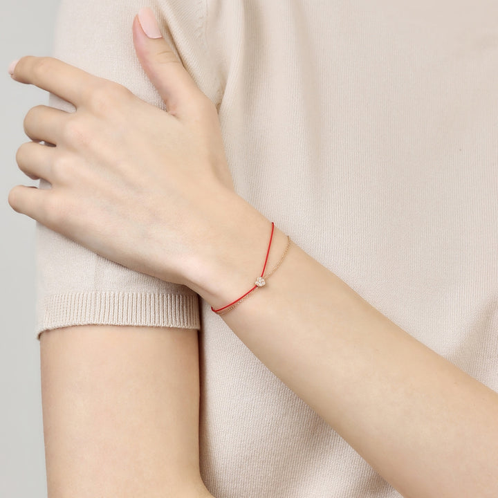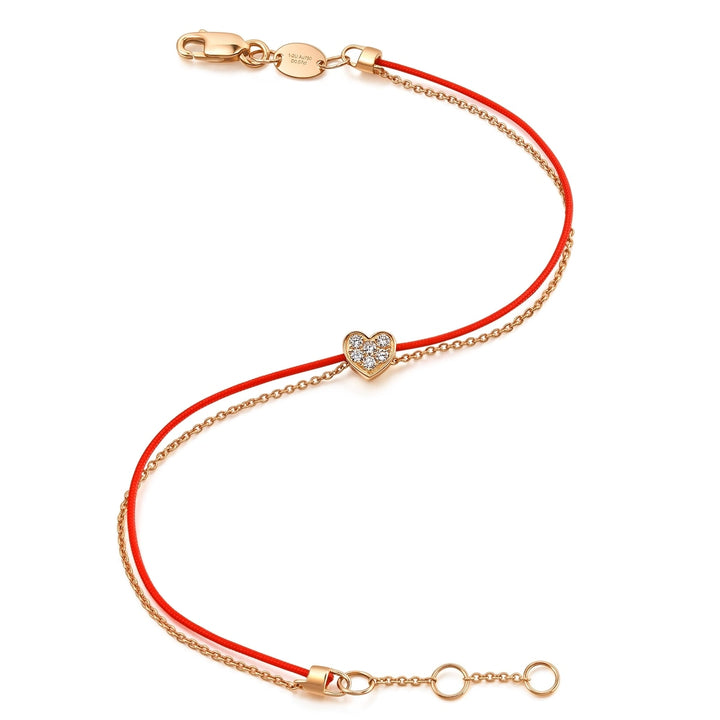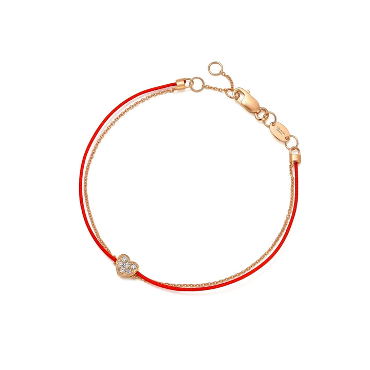 This Love Knot 18K Rose Gold Diamond Bracelet by Chow Sang Sang showcases a classic heart shape, representing true love. The dazzling diamonds on a red string grant warmth and energy, making this bracelet a timeless piece of romantic elegance.