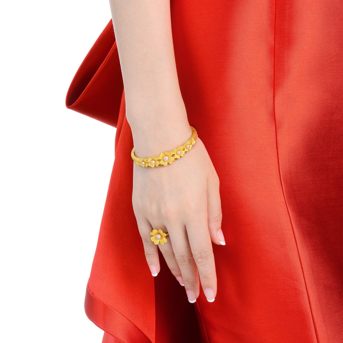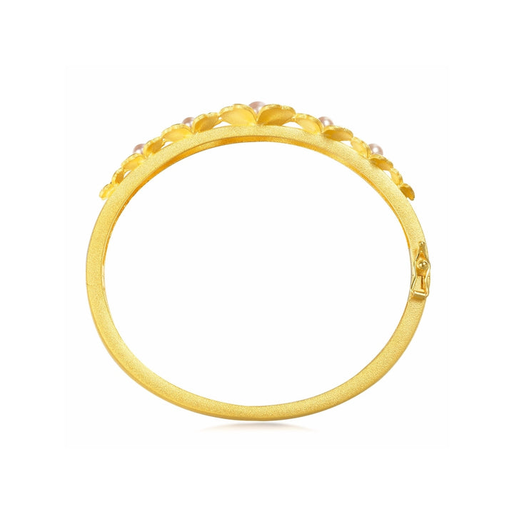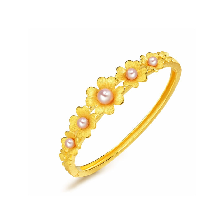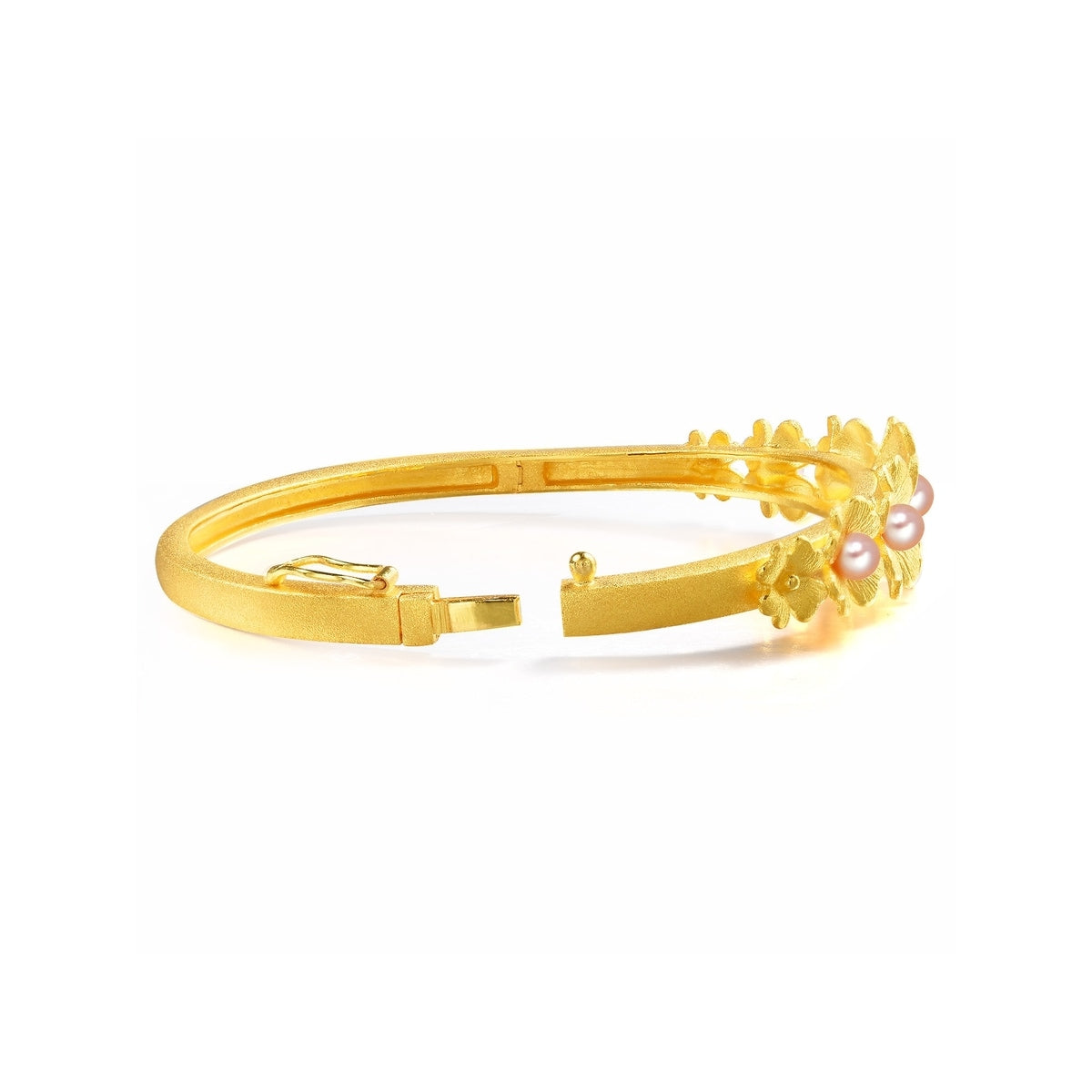 The 'Floral' 999.9 Gold Bangle by Chow Sang Sang' symbolizes abundant luck with a beautiful bracelet featuring four-leaf clovers, each carrying a lustrous pearl at its heart, creating a lovely contrast with the pure gold finish.