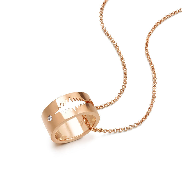 The '18K Rose Gold Diamond Necklace by Chow Sang Sang' captures the unique soundwaves of the phrase “I Love You,” offering a romantic and timeless design. The delicate diamonds and rose gold setting create a graceful expression of love.