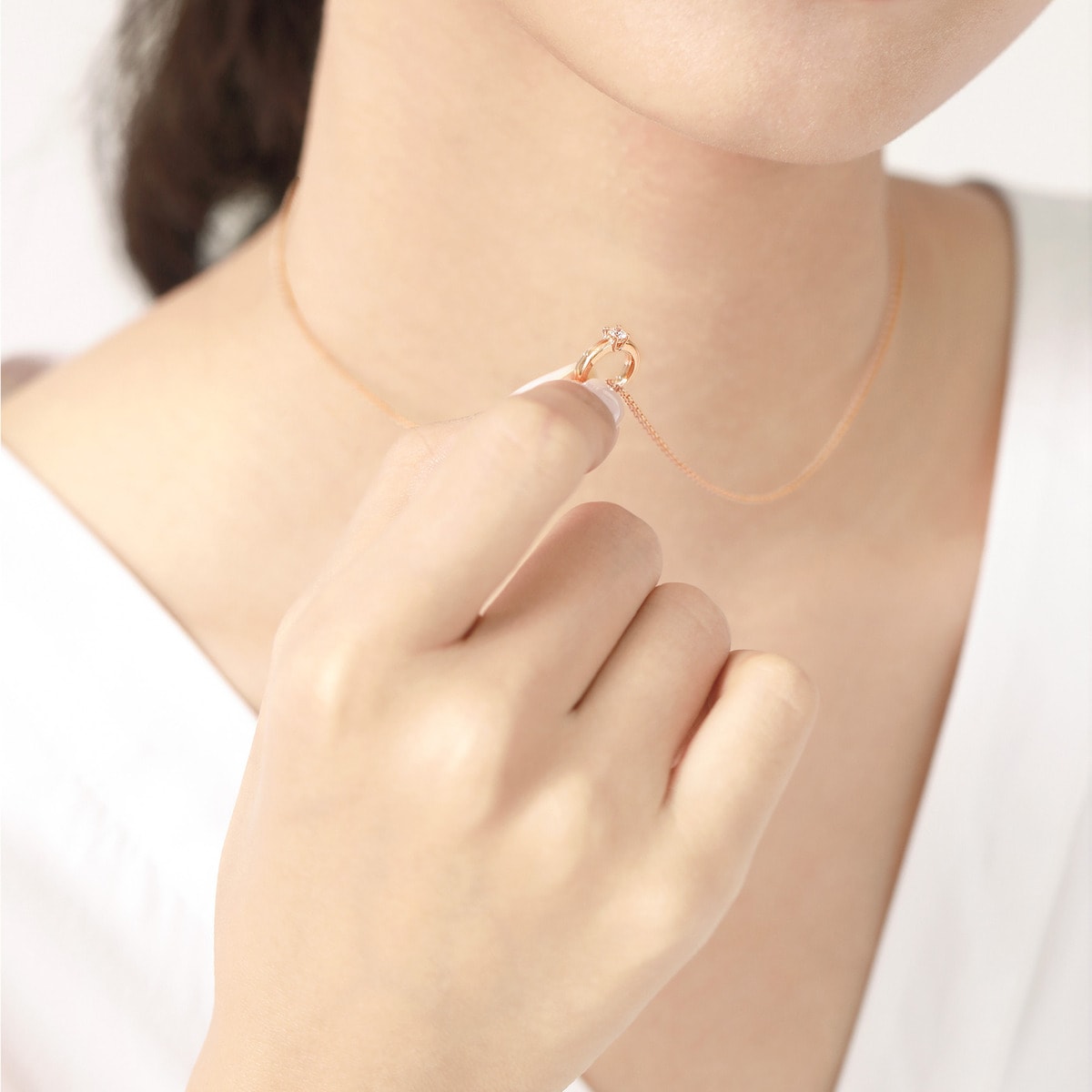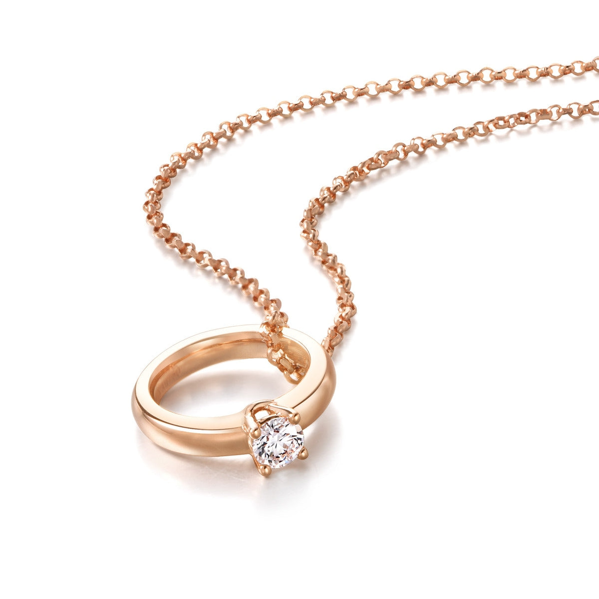 The '18K Rose Gold Diamond Necklace by Chow Sang Sang' features a deeply thoughtful pendant, encircled by diamonds, symbolizing a lifelong promise that can be kept close to the heart. This elegant piece is perfect for meaningful occasions.