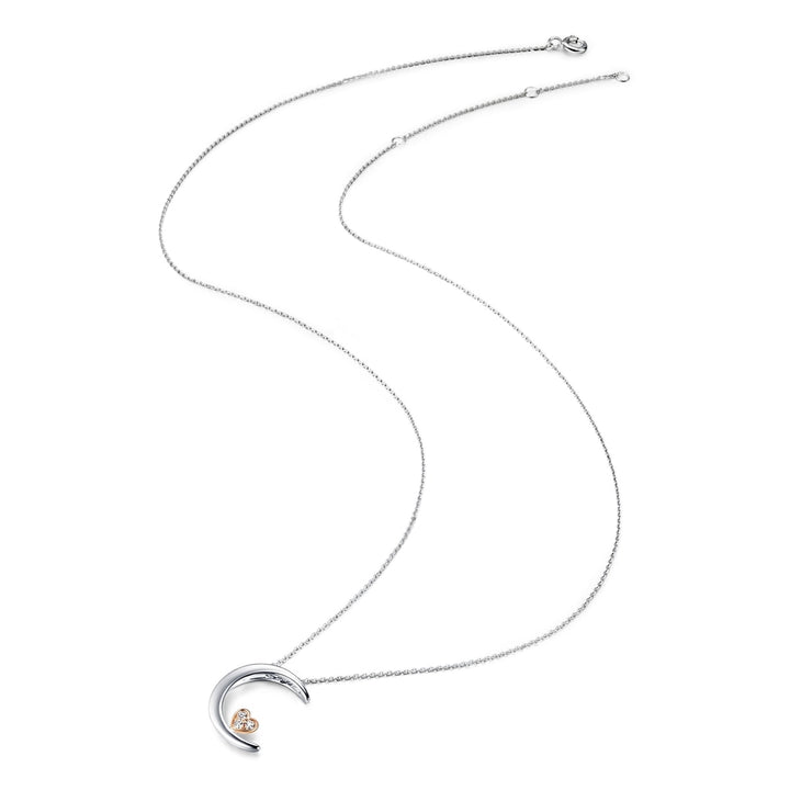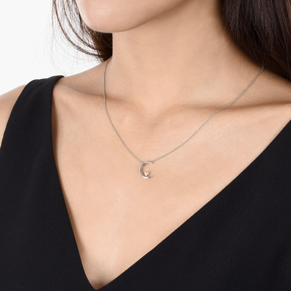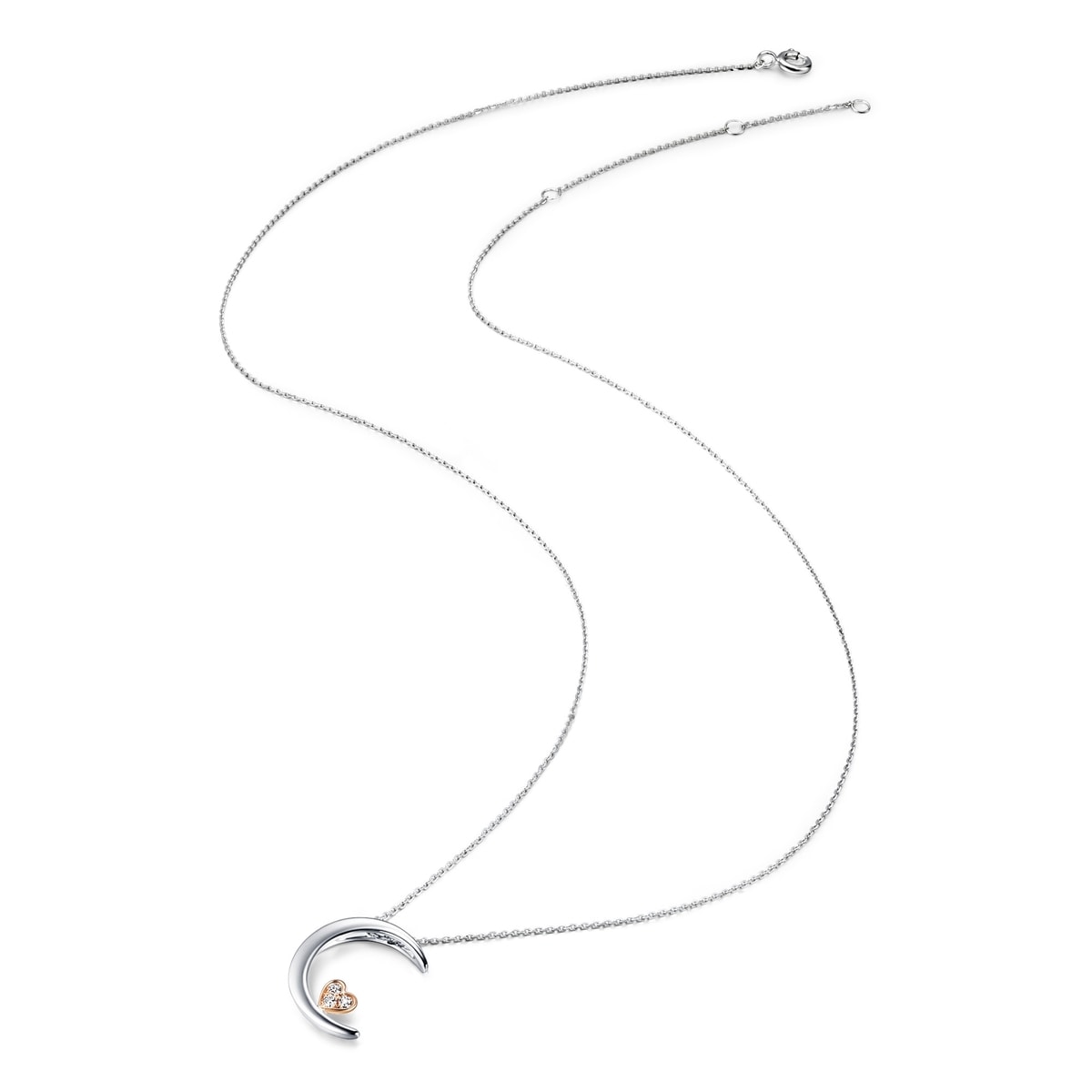 The '18K White & Red Gold Diamond Necklace by Chow Sang Sang' is inspired by the romantic song “The Moon Represents my Heart,” featuring a waxing moon set with diamonds, symbolizing deep affection. (SI1-SI2 Clarity; Color Grade: G-H)