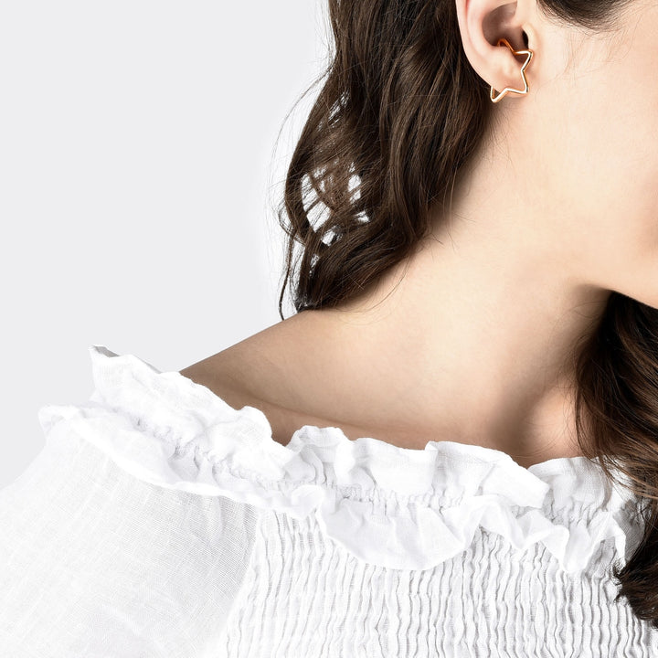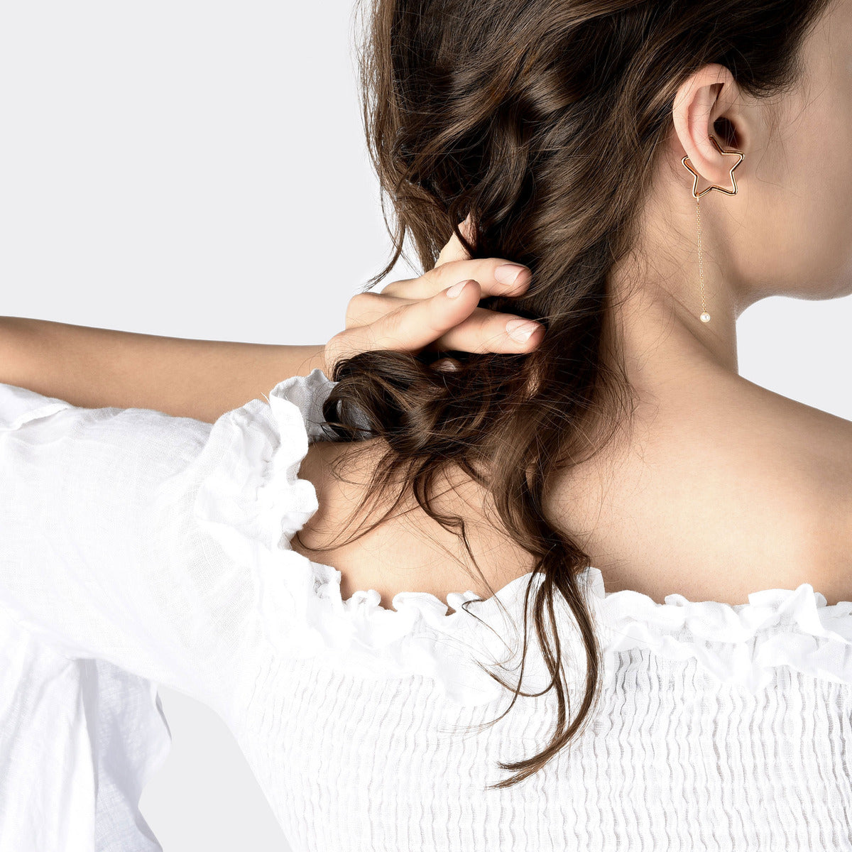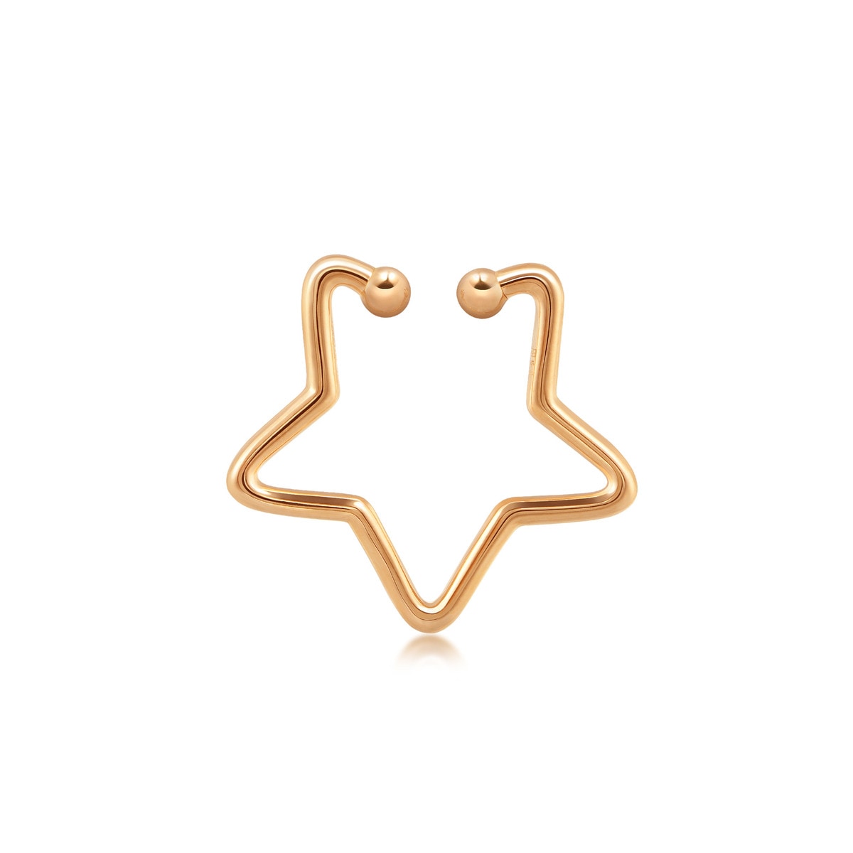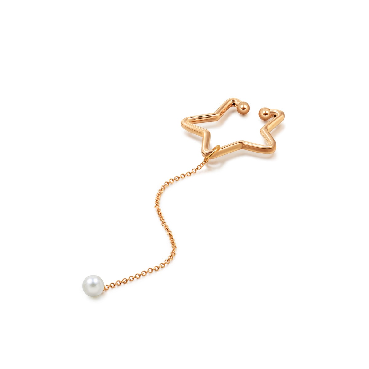 The 'Ear Play 18K Red Gold Single Earring by Chow Sang Sang' is a star-shaped open hoop earring that can be worn alone or mixed and matched with various trickling accessories, showcasing multiple styles.