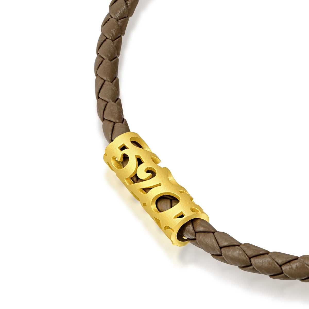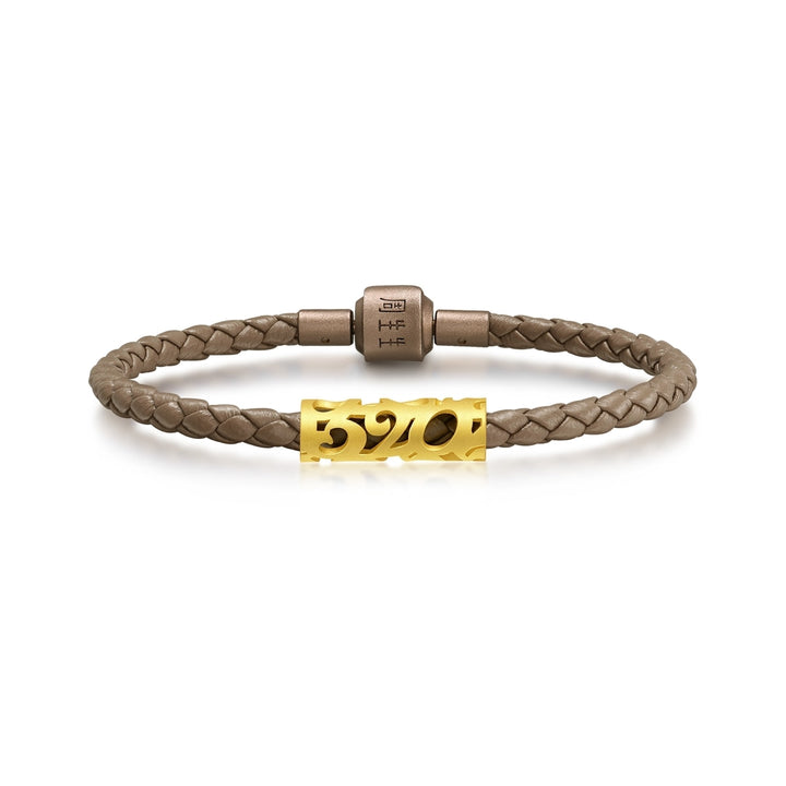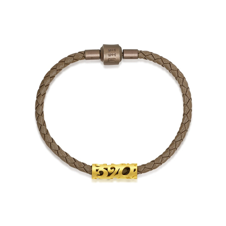 The '999.9 Gold Bracelet by Chow Sang Sang' features a hollow filigree gold Charme that subtly declares love with the romantic code '520' on a leather bracelet.