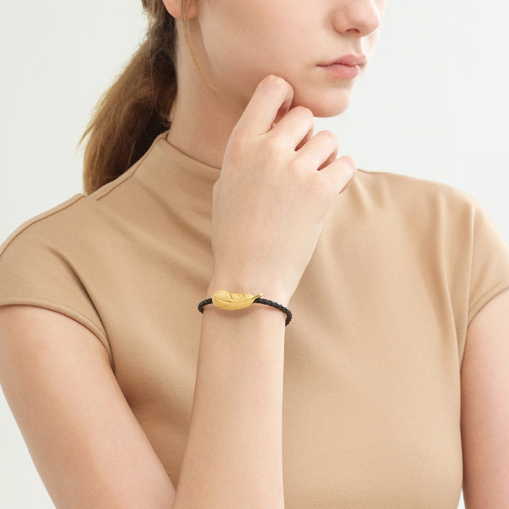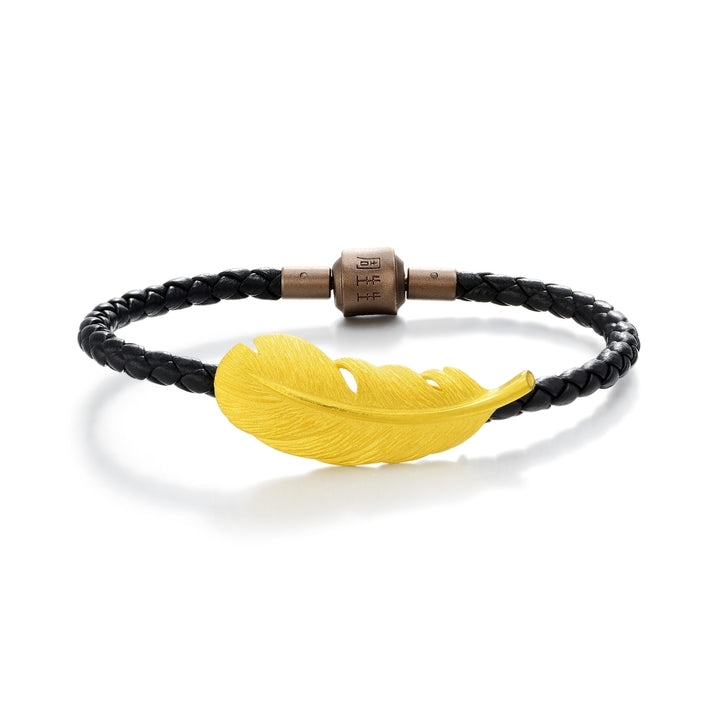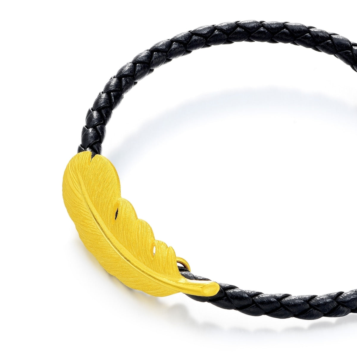 The '999.9 Gold Feather Bracelet (Chic Leather) by Chow Sang Sang' is inspired by Greek mythology, featuring Cupid’s feather which symbolizes love and protection, elegantly testifying to lovers’ moments.